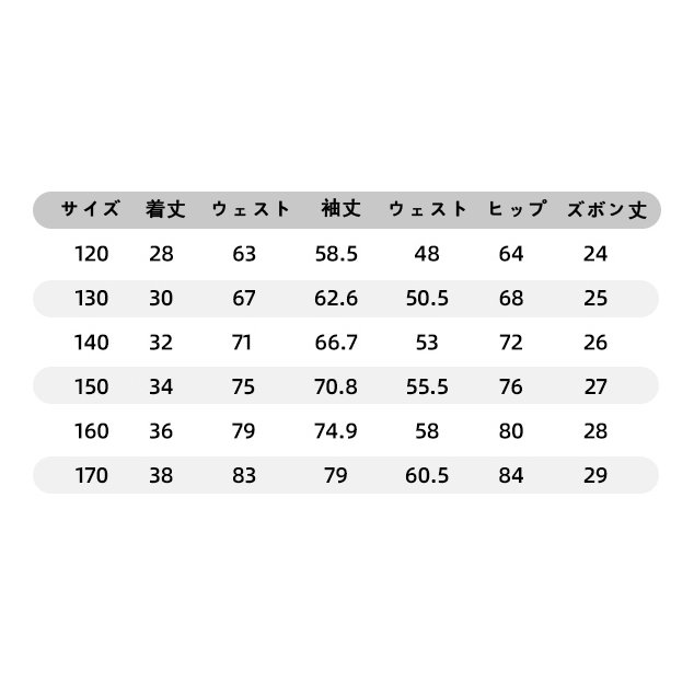 | サイズについての説明 | 【サイズ】 【120】参考身長110-120cm 【130】参考身長120-130cm 【140】参考身長130-140cm 【150】参考身長140-150cm 【160】参考身長150-160cm 【170】参考身長160-170cm 【180】参考身長170-180cm |