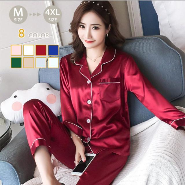 パジャマ レディース ルームウェア 部屋着 長袖 上下セット かわいい 秋 冬 シルク ナイトウェア 女性 白 赤 緑 銀 ピンク 紫 M L XL XXL