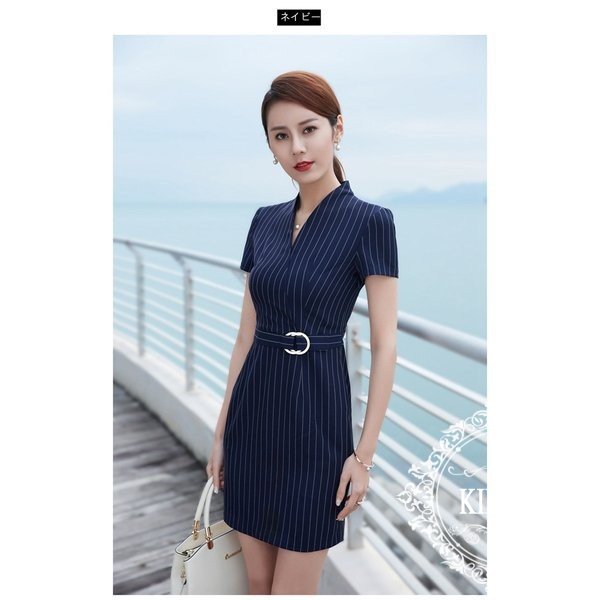 ワンピース 半袖 ストライプ Vネック 2色 膝丈 Aライン タイト レディース 大きいサイズ 着痩せ 通勤 OL オフィス ビジネス 仕事 夏 新作