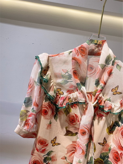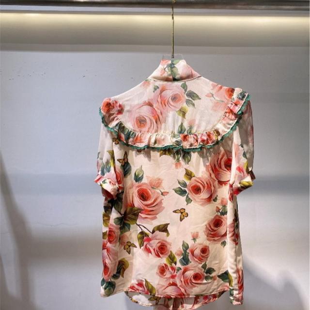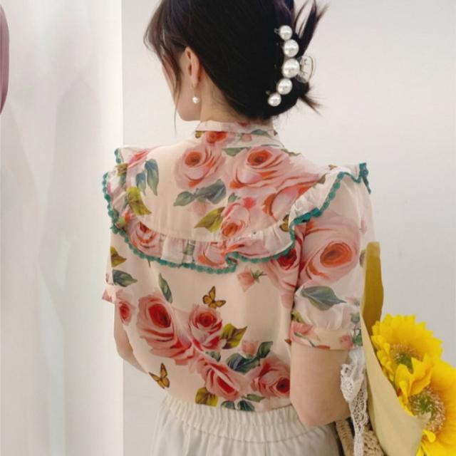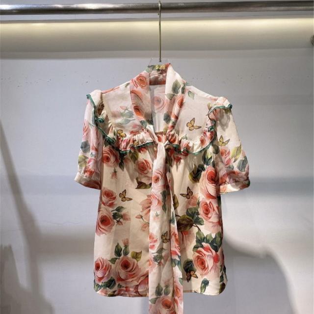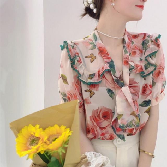 ブラウス レディース 40代 春夏新作 オシャレブラウス 花柄 ゆったりシャツ 上品 半袖トップス シフォンブラウスリボンネック 韓国風 通勤 50代 30代 Vネック