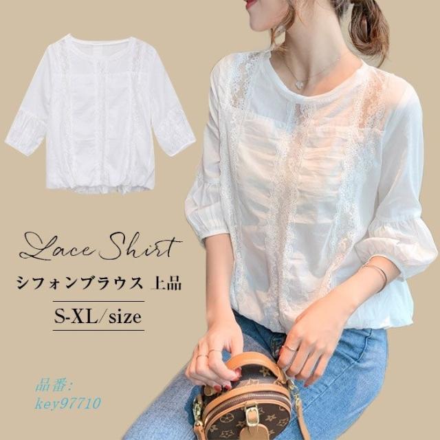 ブラウス レディース シフォンブラウス 白シャツ OL 大人 上品 オシャレ フォーマル シャツ 韓国風通勤 夏 オシャレブラウス レース トップス 七分袖ブラウス