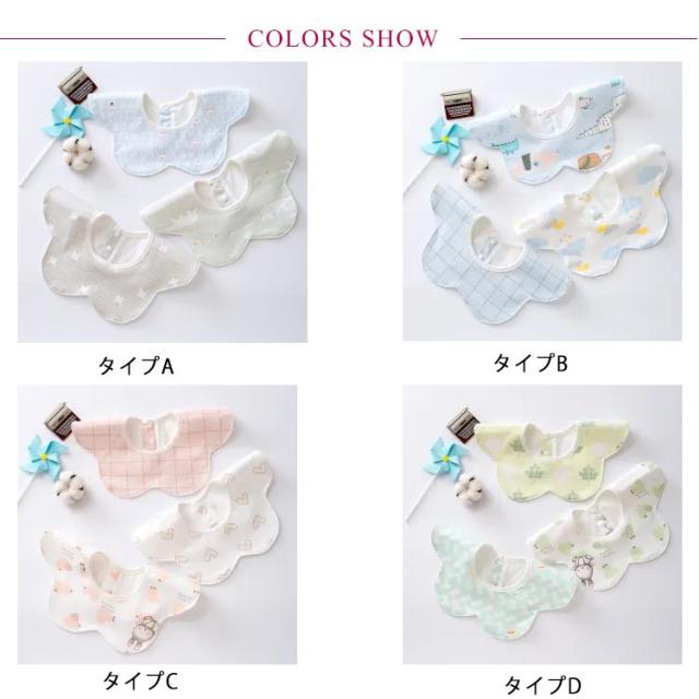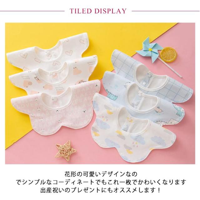 | まるい花形の可愛いスタイ、お得な3枚セット! 360度回してタイプでちゃんと赤ちゃんのよだれをキャッチ! 防水性のある生地を挟んでいるので吸収性と防水性が抜群の3層構造 花形の可愛いデザインなのでシンプルなコーディネートでもこれ一枚でかわいくなります 出産祝いのプレゼントにもオススメします! | |