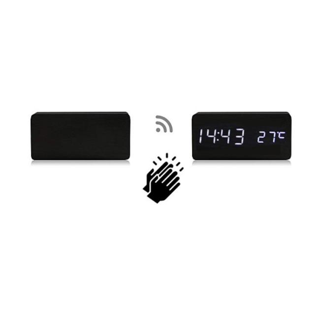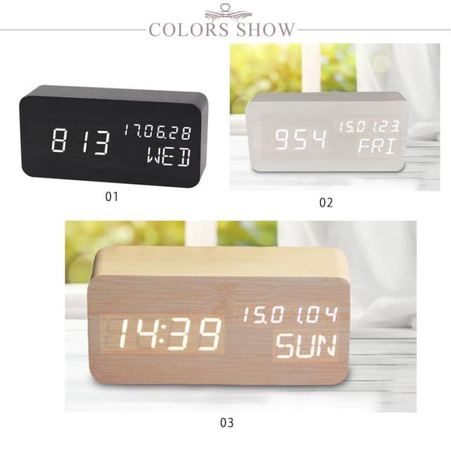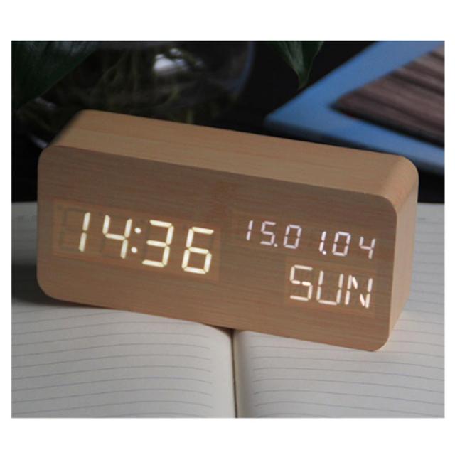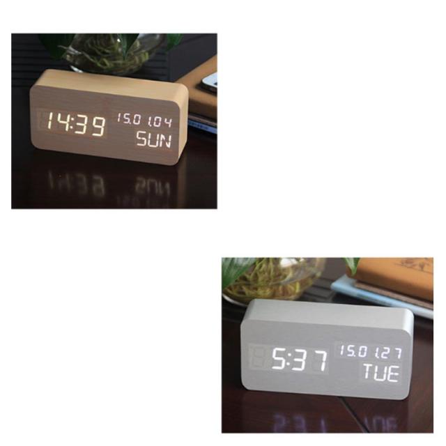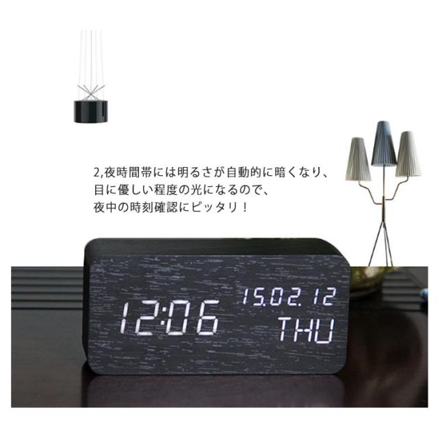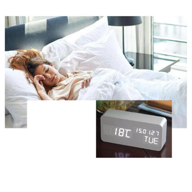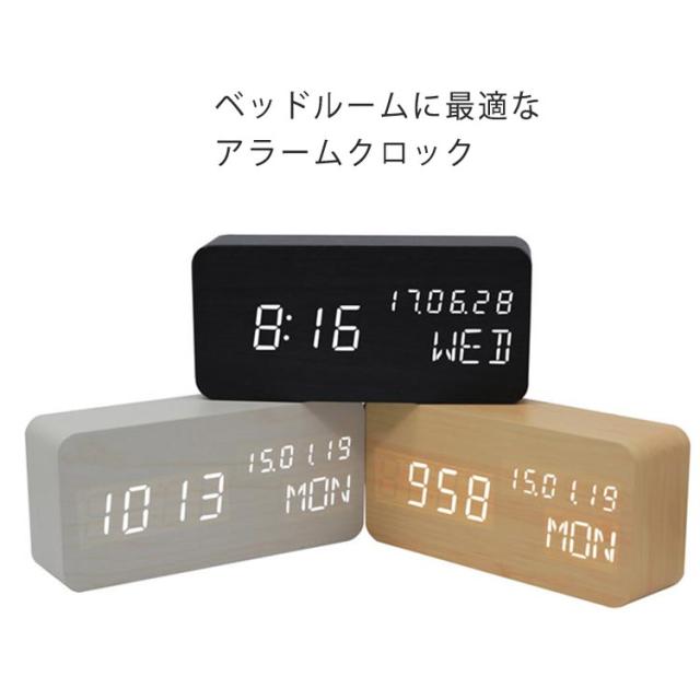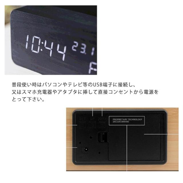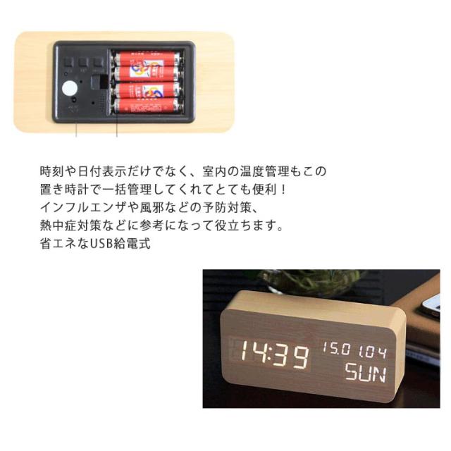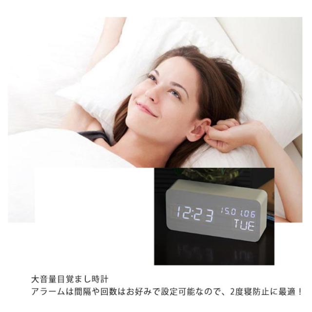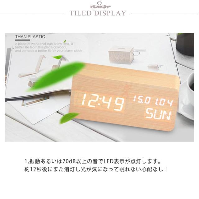 目覚まし時計 置き時計 デジタル LED表示 大音量 温度計 木目調 カレンダー アラーム 振動/音感センサー 輝度調節 設定記憶 USB給電
