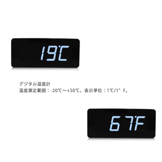 | ベッドルームに最適なアラームクロック 1,振動あるいは70dB以上の音でLED表示が点灯します。約12秒後にまた消灯し光が気になって眠れない心配なし! 2,夜時間帯には明るさが自動的に暗くなり、目に優しい程度の光になるので、夜中の時刻確認にピッタリ! 3,iPhone とほぼ同じなコンパクトサイズで、アラームの設定や解除する時に持ちやすいです。 大音量目覚まし時計 アラームは間隔や回数はお好みで設定可能なので、2度寝防止に最適! 平日、毎日区分してウェイクアップ時間を設定可能!鳴りっぱなしを防止ため、鳴り始めから1分後に自動停止。もちろん任意ボタンを押しても解除できます。 デジタル温度計 温度測定範囲:-20℃〜+50℃。表示単位:1℃/1°F。 時刻や日付表示だけでなく、室内の温度管理もこの置き時計で一括管理してくれてとても便利!インフルエンザや風邪などの予防対策、熱中症対策などに参考になって役立ちます。 省エネなUSB給電式 普段使い時はパソコンやテレビ等のUSB端子に接続し、又はスマホ充電器やアタプタに挿して直接コンセントから電源をとって下さい。 | |