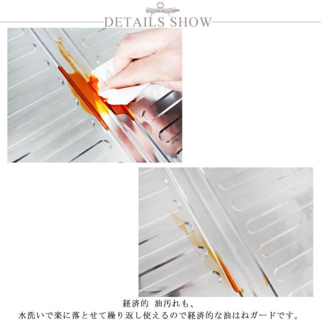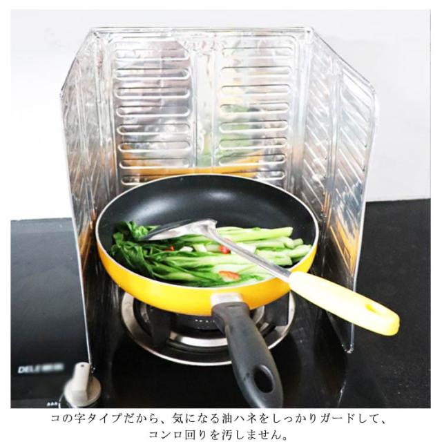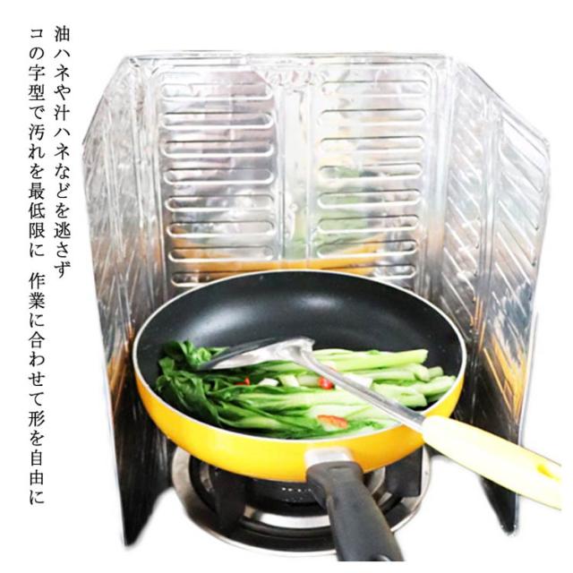 | 油ハネや汁ハネなどを逃さず 組み立てるの必要がなく、使いたい時に、サッと置くだけで使用できるレンジガードです。油が飛び散りやすいレンジ周りの油ハネを最小限にしっかりとガードできます。掃除の時短にもつながります。 経済的 油汚れも、水洗いで楽に落とせて繰り返し使えるので経済的な油はねガードです。 コの字型で汚れを最低限に コの字タイプだから、気になる油ハネをしっかりガードして、コンロ回りを汚しません。 作業に合わせて形を自由に 作業に合わせて、ー型、L型、コ型で2つのコンロを囲ったり使いやすく形を変えられます | |