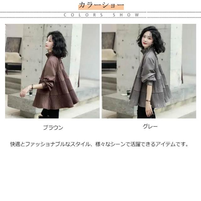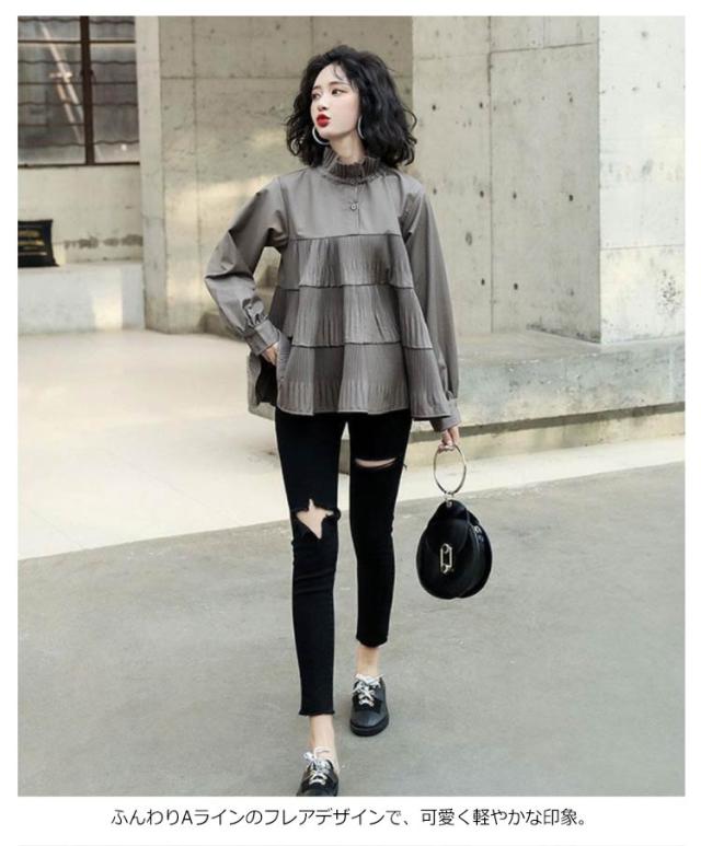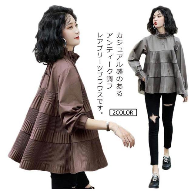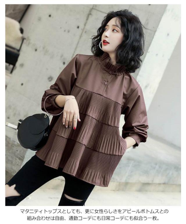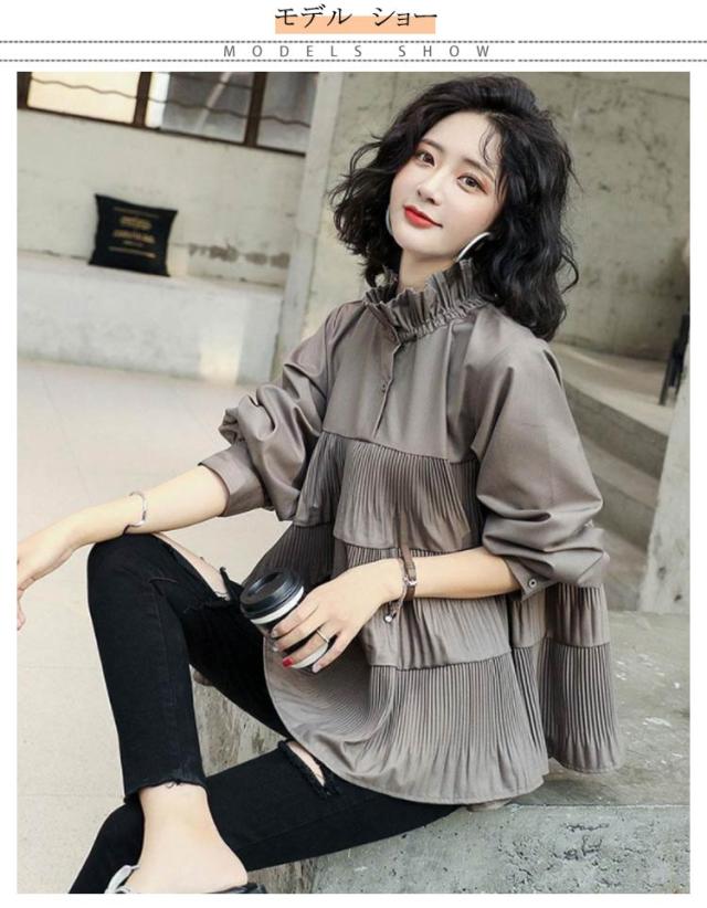 アンティーク調 フレアプリーツブラウス レディース 長袖 シャツチュニック フリルネック 切り替え オフィス スタンドカラー スタンドフリル 体型カバー かわいい カジュアル きれいめ 春 秋 送料無料