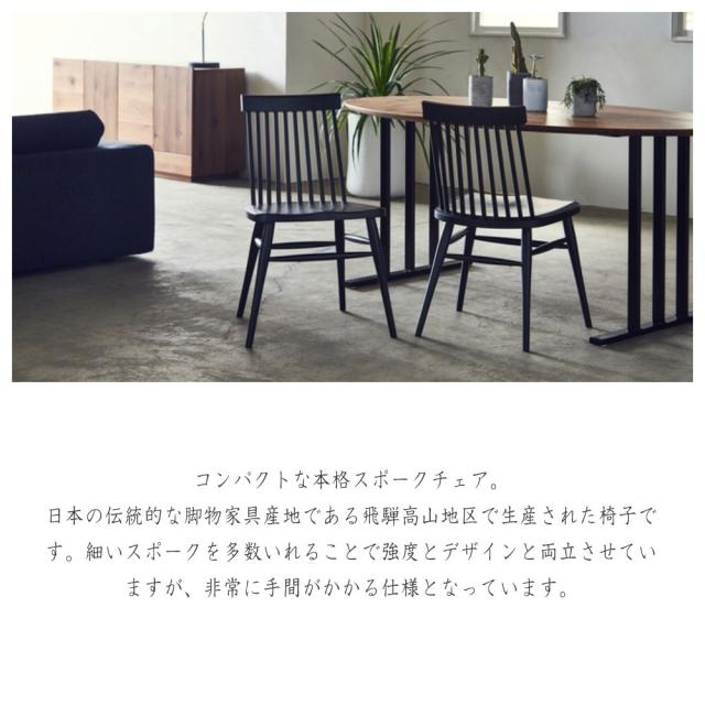 | 説明 | コンパクトな本格スポークチェア。 日本の伝統的な脚物家具産地である飛騨高山地区で生産された椅子です。細いスポークを多数いれることで強度とデザインと両立させていますが、非常に手間がかかる仕様となっています。 |