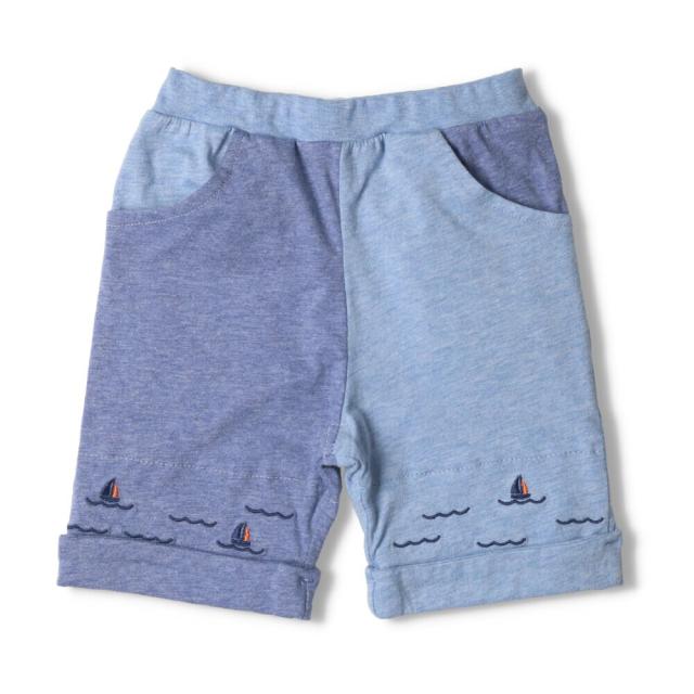 Tシャツ、天竺素材で涼しく着られるハーフパンツ。コン×ブルーの配色デザインと合わせやすい単色のブルー、夏らしいカラフルなチェックの3色展開。裾はロールアップデザイン。波とヨットの刺繍もポイント!【アイテム】プレゼント ギフト 赤ちゃん服 ベビー服 贈り物 無地 シンプル カジュアル お洒落 オシャレ かわいい 可愛い かっこいい カッコイイ 普段着 デイリーウェア お出かけ着 ボトムス 膝丈 ハーフパンツ 半パン 短パン 半ズボン 子ども こども 男児 男の子 ボーイズ キッズ ベビーサイズ 幼稚園 保育園通園 2022年夏物新作 丸高衣料 紺色 青色 カラフル コットン100% 綿100%