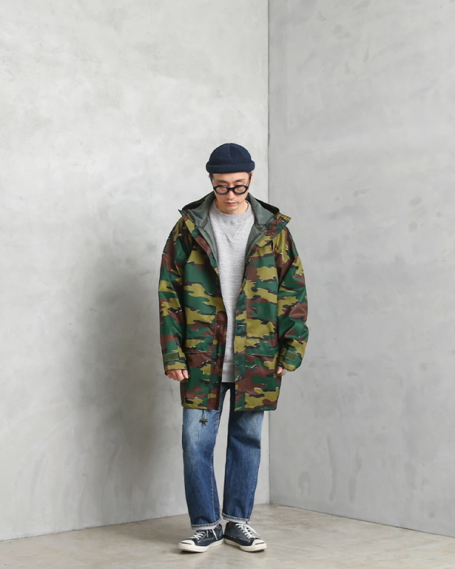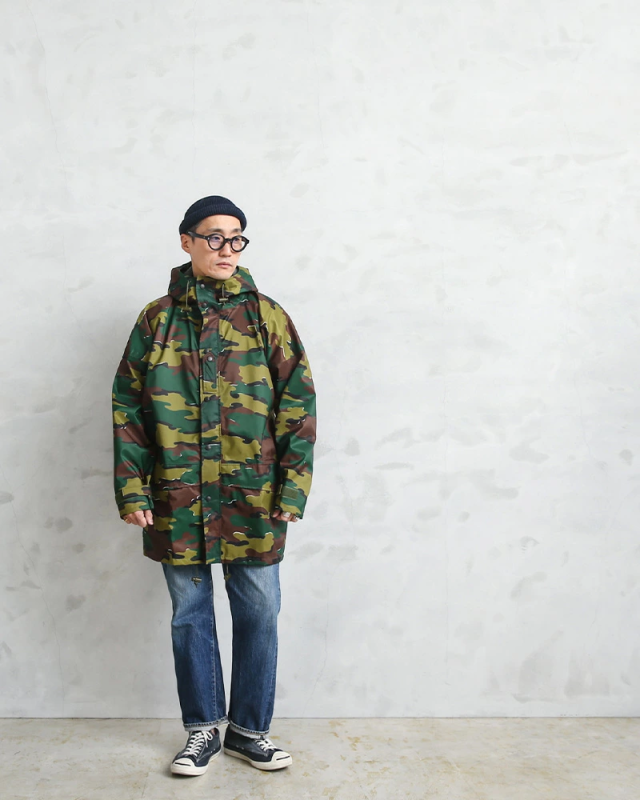 | 商品説明 | 実物 新品 デッドストック ベルギー軍 M-90 ジグソーカモ WATERPROOF フィールドパーカーのご紹介です。 ベルギー軍より90年代後半に採用された透湿防水タイプの機能性に優れたフィールドパーカーが入荷!圧倒的な人気を誇る米軍の“ECWCS パーカー”と同じような環境下で使用されるアイテムの希少なデッドストックです! シェルは撥水素材で裏地は内側からの水蒸気を逃し、雨などの水滴は通さない事でドライな状態を保ち、風を通さないことで保温性も向上させる高機能素材の透湿性防水生地を使用しています。 縫製部分は裏側からシームテープ処理が施されており、フロント開閉はダブルジッパーとスナップボタンの二重構造で雨、風、雪の侵入をシャットアウトします。 フード一体型のデザインで首元までボタン留めできるデザインが風の侵入を防ぎ、単体での使用はもちろん、フリース、スウェット、セーターなどを着ていただくことでさらに保温性を高めます。 フードと裾にはドローコード付きで絞ることができ、袖口もベルクロで絞ることが可能です。フロント下部にフラップ付きのジップポケットが両サイドに備わっています。 年間を通してレインウェアとして活躍しますし、春や秋には軽く羽織れるライトアウター、冬にはレイヤードすることで最高の防寒性を発揮するアウターとして活躍します。デイリーユースからアウトドアまで1枚あるとコーディネートの幅が広がるアイテムです。 | ||||||||||||||||||||||||||