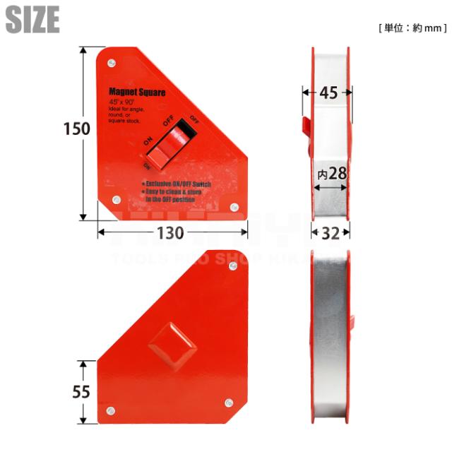 溶接や組立作業での仮押さえ、仮組みなどに! ●溶接作業や組立て作業時にあると便利な六角ホルダーです ●仮押さえや仮組みの際にさまざまな角度で金属を保持します ●45度・90度・135度、3通りの保持角度がとれます ●溝付きなので、丸パイプや丸鋼も吸着します ●吸着ON/OFFが切替えできるので、脱着や位置決めが容易に行えます ※非鉄金属には使用出来ません ※重量物や大きな物への使用は危険ですのでおやめください ★「マグネット六角ホルダー (小) 2個セット レッド」も別途販売しております |