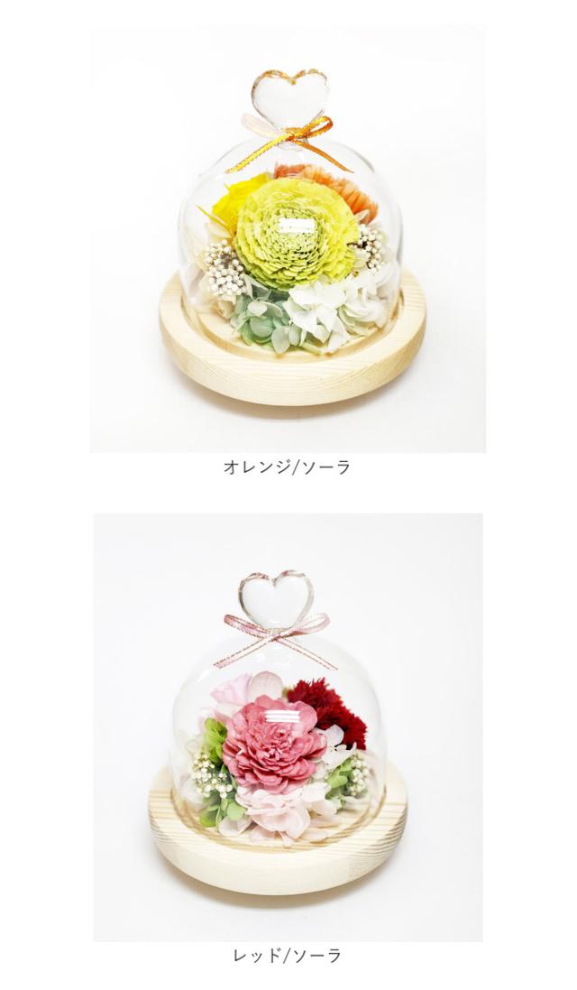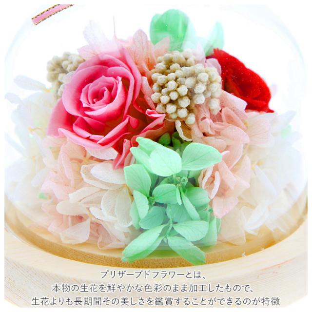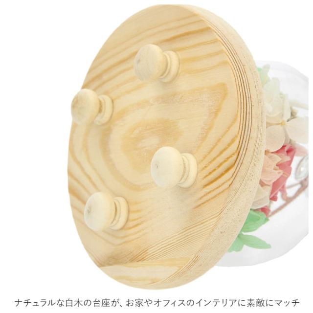 | 素材 | [花材]プリザーブドフラワー、ドライフラワー(自然素材) フローラルフォーム(フェノール樹脂) [ドーム]ガラス [台座]天然木 |