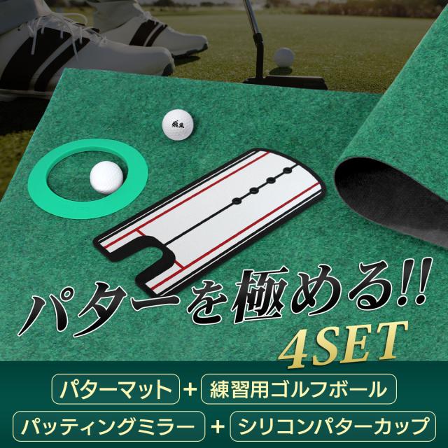 ベント芝を再現した高速パターマットです。癖を修正できるパッティングミラーとカップ、ボールの付いた4点セットで自宅にいながらスキルアップ!
