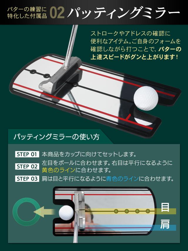 パターマット、練習用ゴルフボール6個、パッティングミラー、シリコンパターカップ