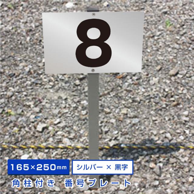 駐車場 アルミ角柱付 番号プレート シルバー H165×W250ミリ 杭 杭付き 角柱 シルバーアルミ複合板番号 砂利 土 更地 駐車場番号看板 scn-101-sv