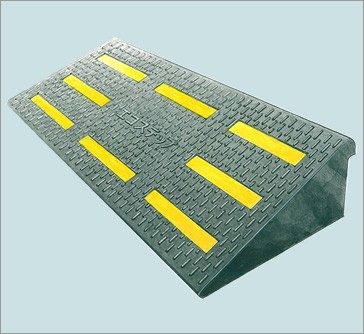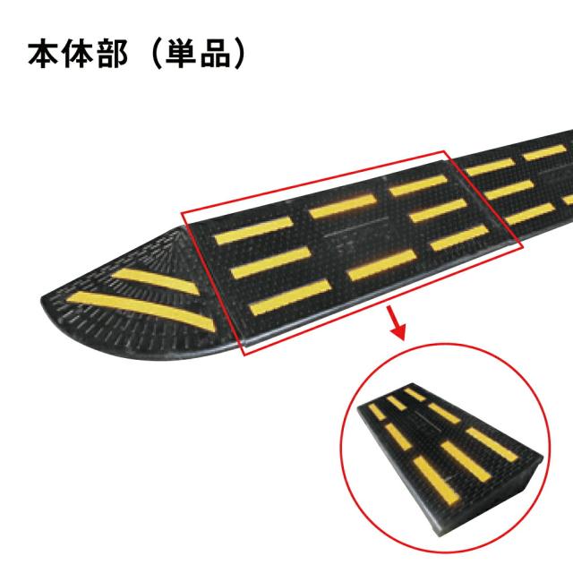 固定用連結ボルトが付属していますので、ずれない安心仕様です。廃タイヤ再生品で、環境にも配慮しており、エコマーク申請中です。タイヤをリサイクルしているため車両乗り上げ時の衝撃が少なく静かで、ソフトな使用感となっています。スリップしにくい表面形状ですので、自転車やバイクでも安心してお使いいただけます。高性能反射シートを採用し、夜間の視認性に優れています。もちろん、耐久性も抜群です。