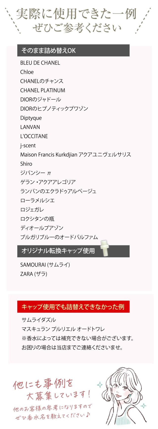 適用範囲:香水、化粧品、アルコール、スプレーなどリキッド状の液体