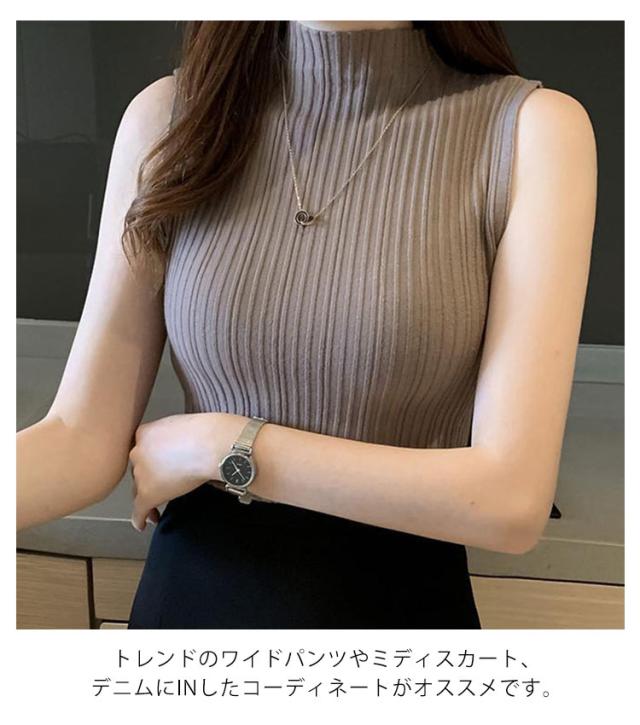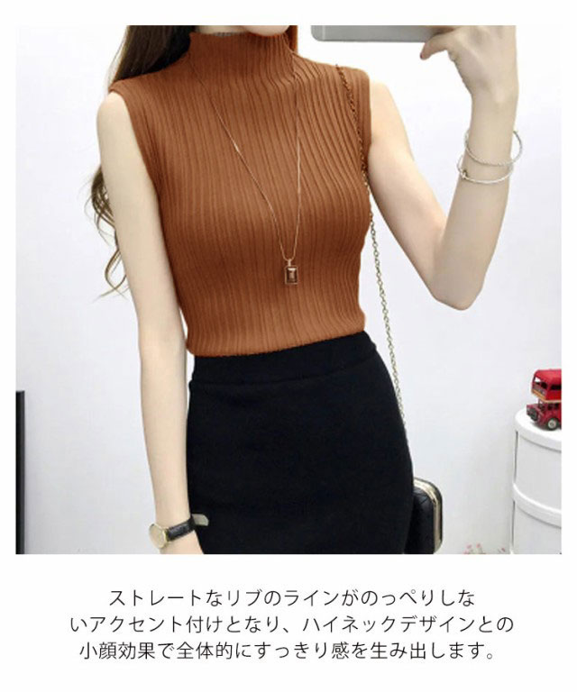 タートルネック ノースリーブ リブニット インナー 春夏 プリーツ編み セーター ハイネック トップス カットソーチュニック レディース ミディアム丈 ハイゲージニット 無地 薄手