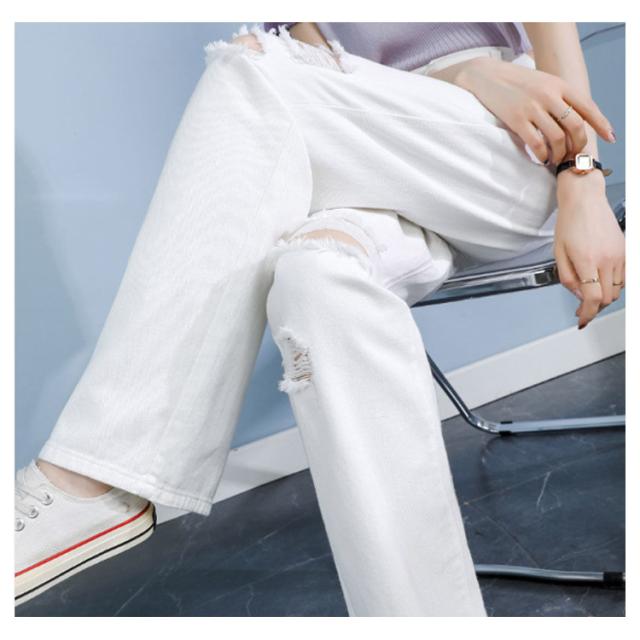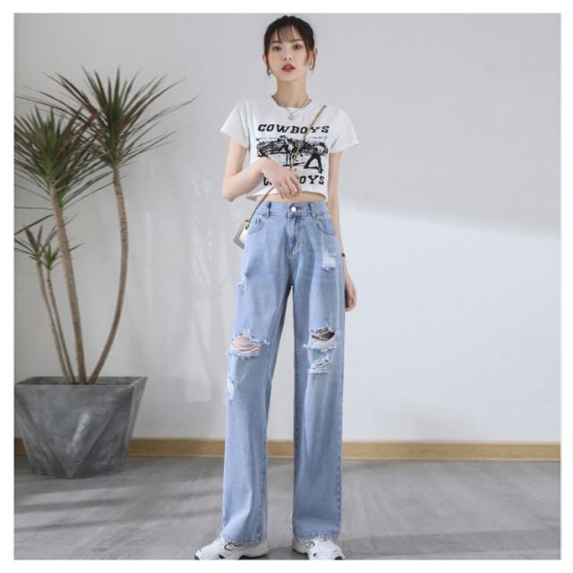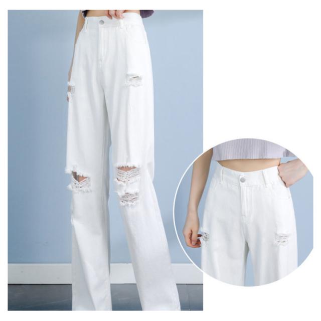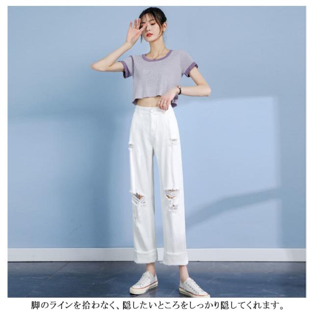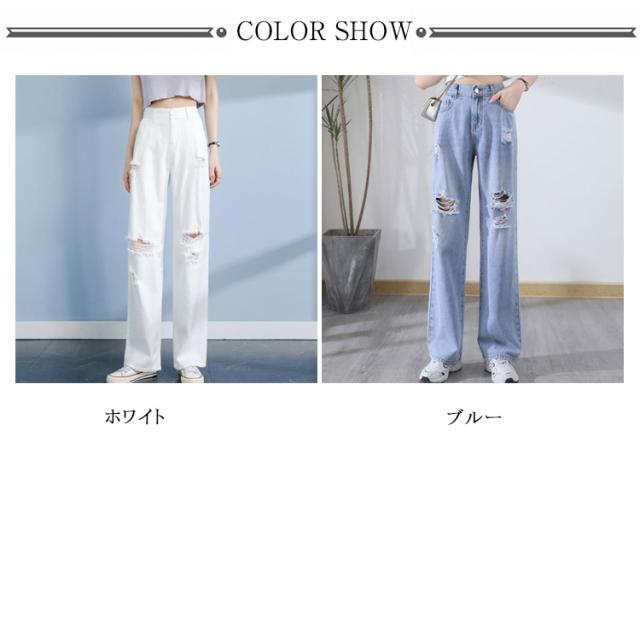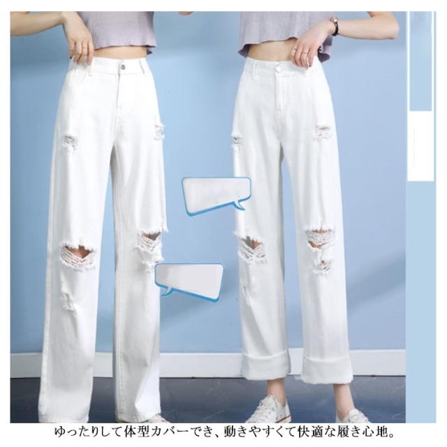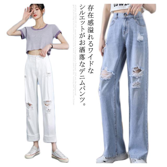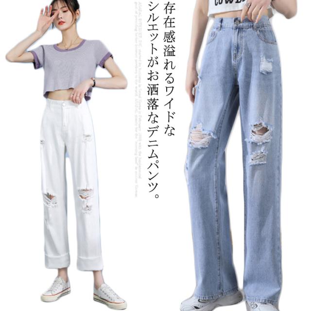 送料無料 デニムパンツ ロングパンツ レディース デニム ワイドパンツ マキシ丈 美脚 ゆったり 体型カバー 着痩せ ダメージ加工 ハイウエスト ボタン ファスナー ポケット 無地 ボトムス カジュアル 通勤 通学 普段着