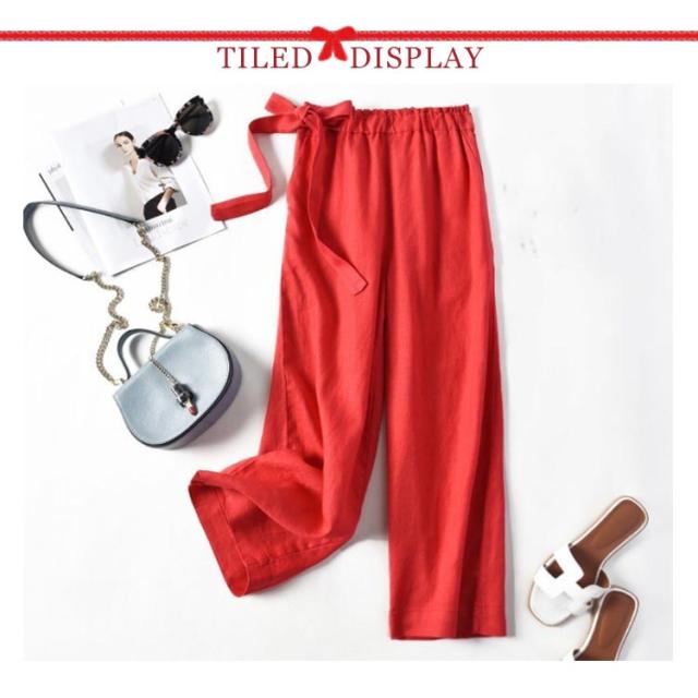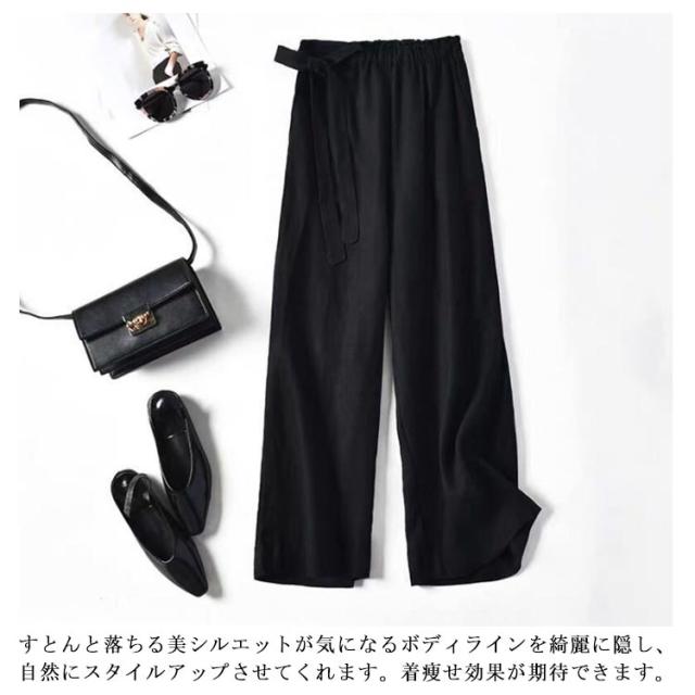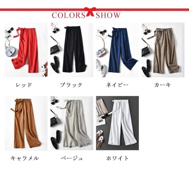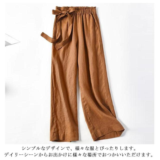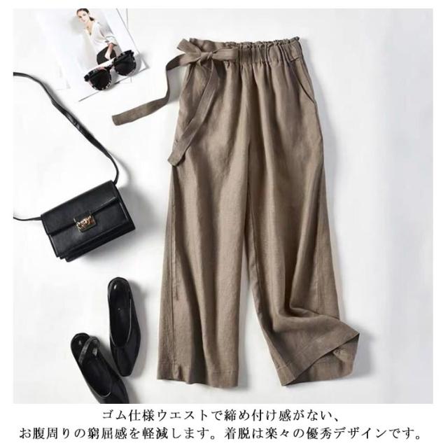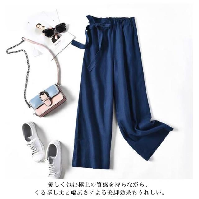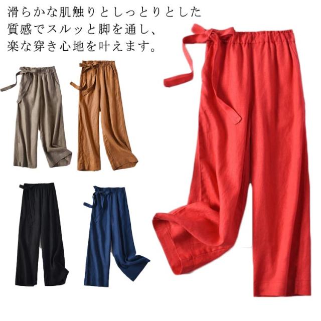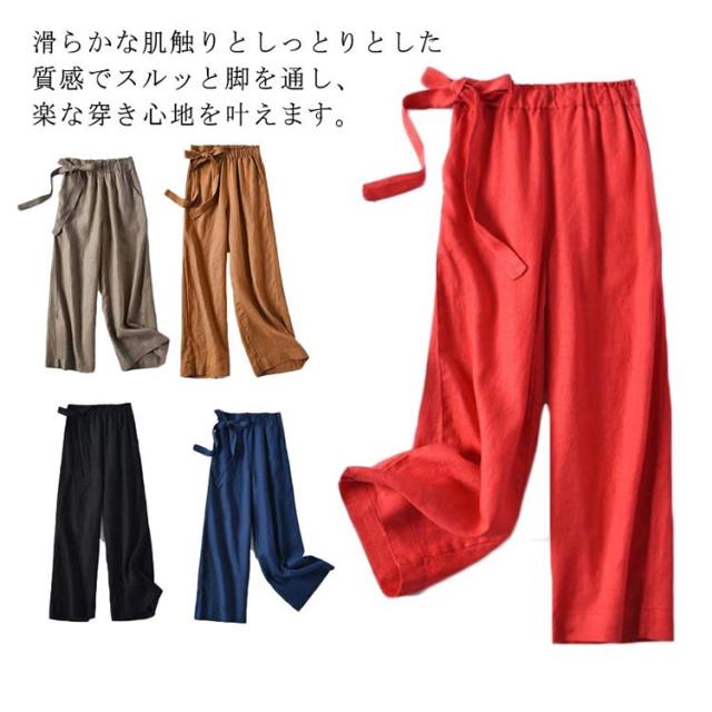ワイドパンツ レディース 綿麻混 ガウチョ 春夏 涼しい リボン パンツ スカンツ ガウチョ ロングパンツ ベイカーパンツ ハイウエスト リネン ウエストゴム 体型カバー バギーパンツ 九分丈 無地