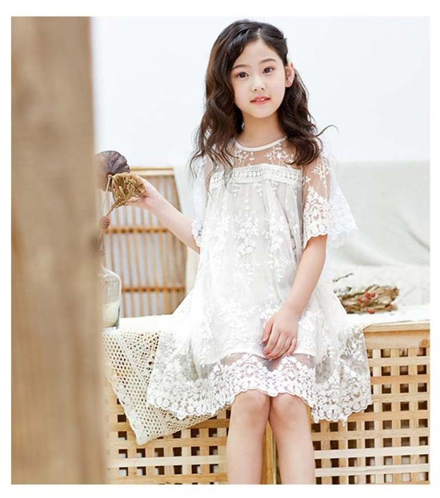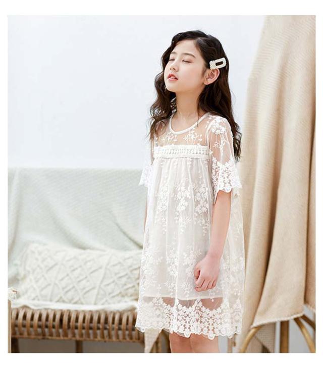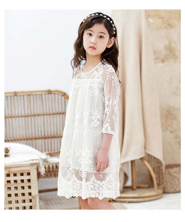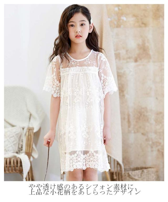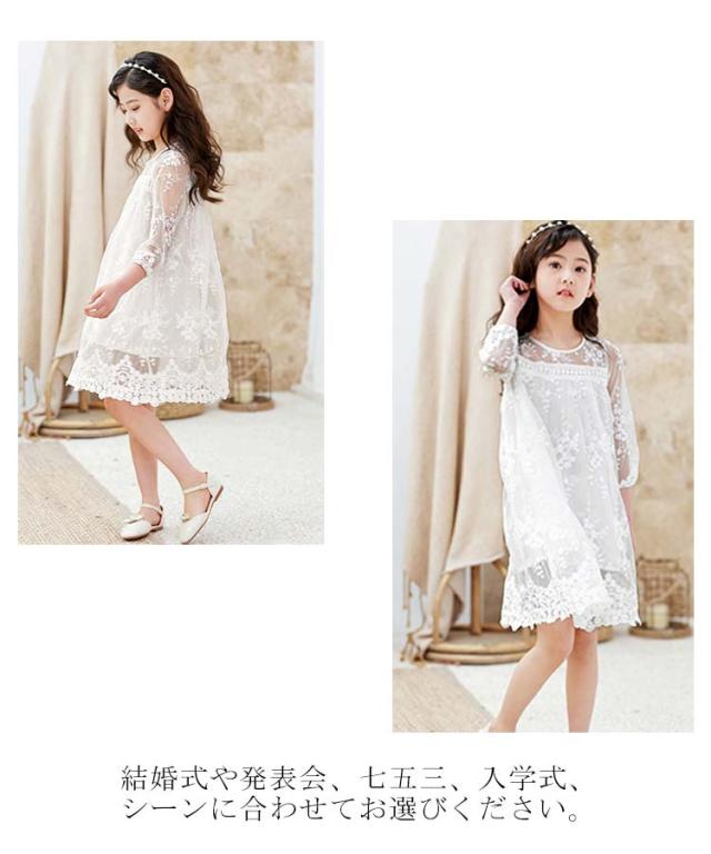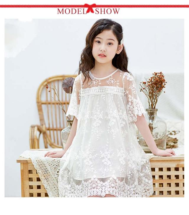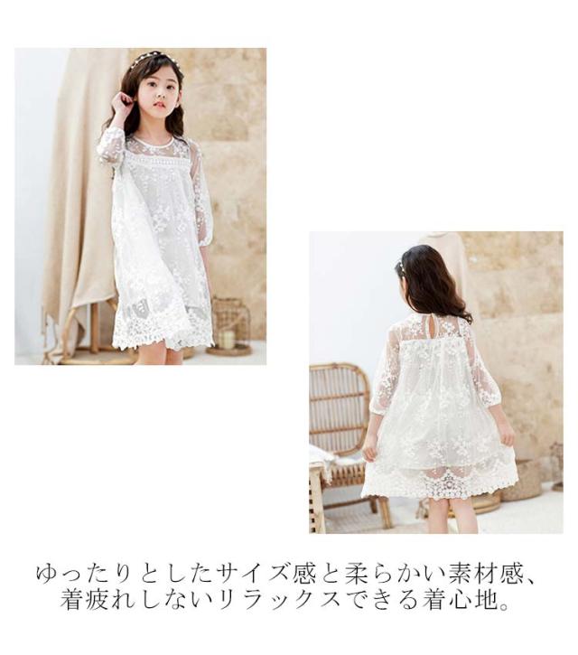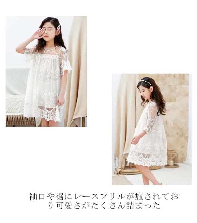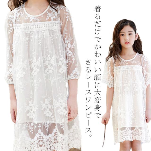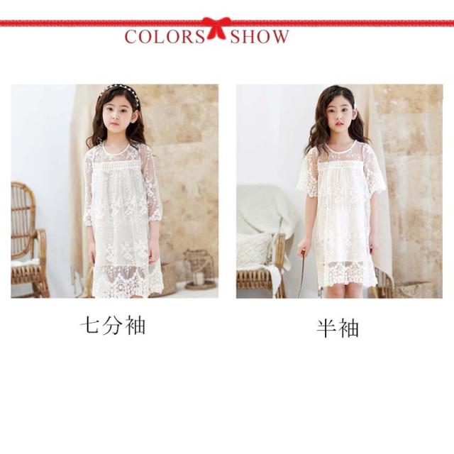 レースワンピース 子供ドレス 女の子 ワンピース レース刺繍 重ね着 フェイクレイヤード 子供服 ドレス フレア シースルー 七分袖 半袖 花柄 クルーネック 送料無料 キッズ ジュニア かわいい おしゃれ シンプル 韓国子供服