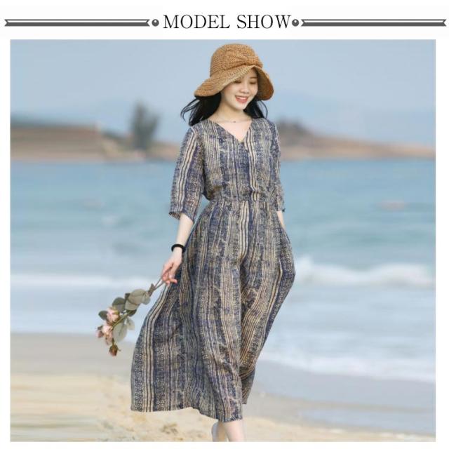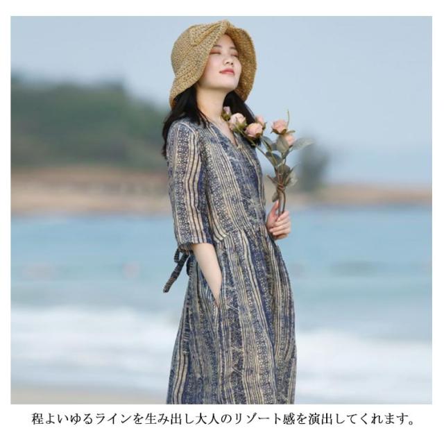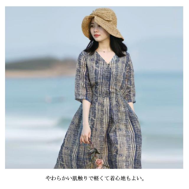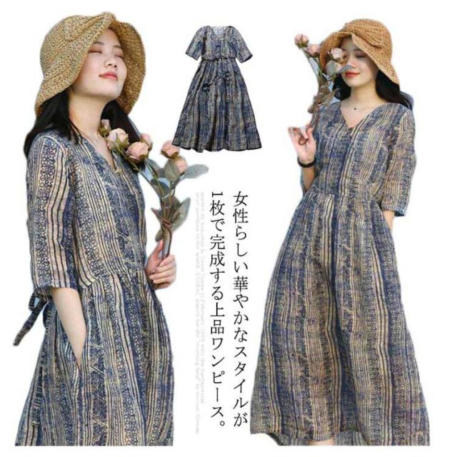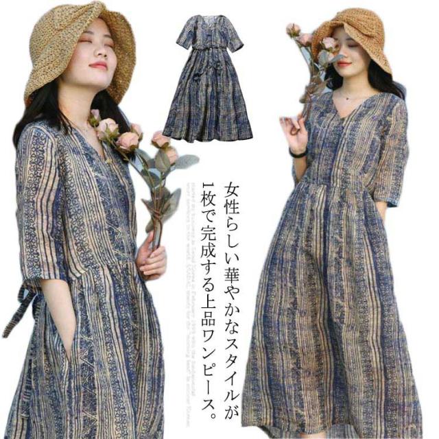 送料無料 レディース ワンピース マキシ 花柄 綿麻ワンピース 5分袖 Vネック 体型カバー トレロ 快適 柔らかい リネン ゆったり ロング Aライン 通勤 通学