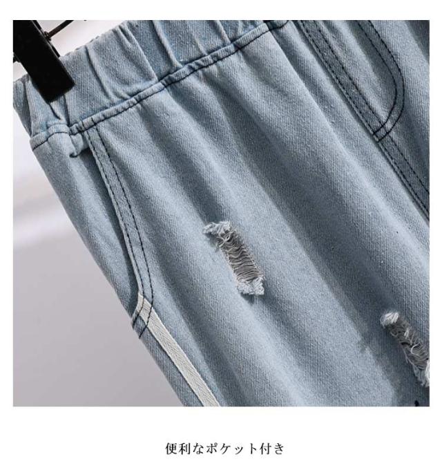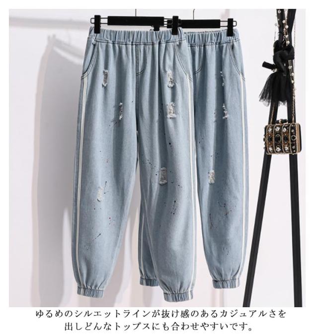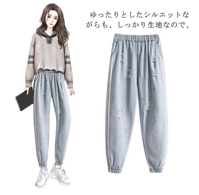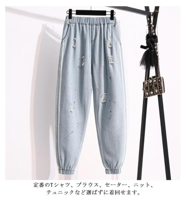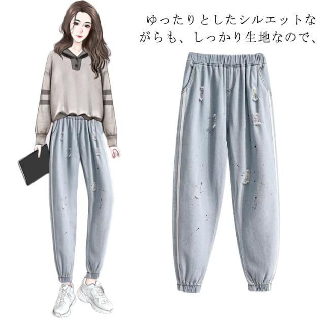 送料無料 デニムパンツ ジョガーパンツ レディース ジーンズ ダメージ加工 ゆったり クラッシュパンツ ウエストゴム テーパードパンツ 春夏 おしゃれ 新作