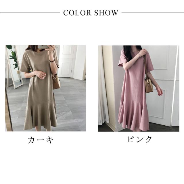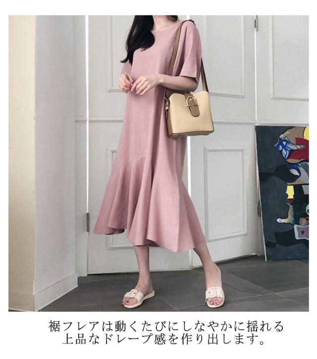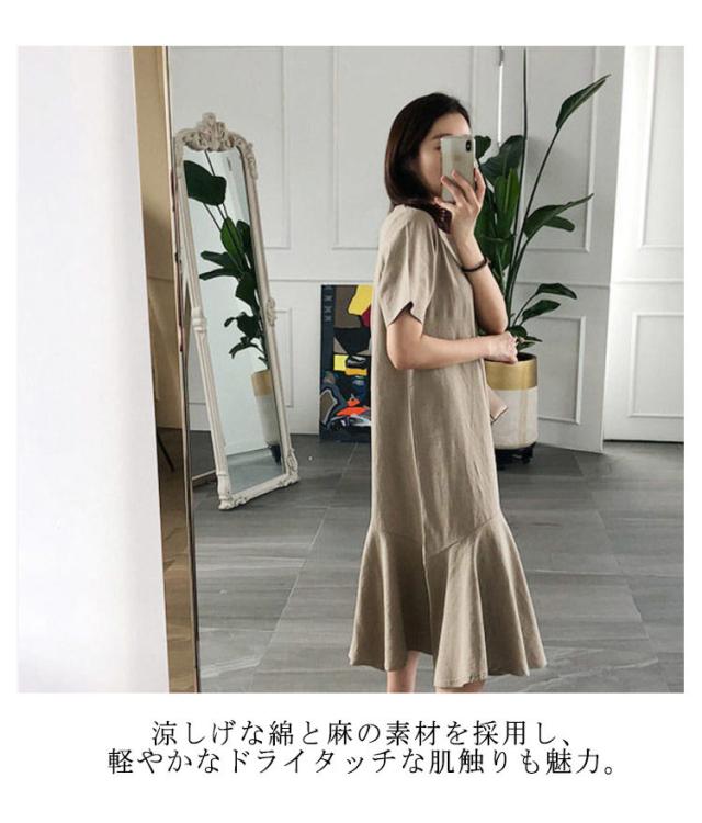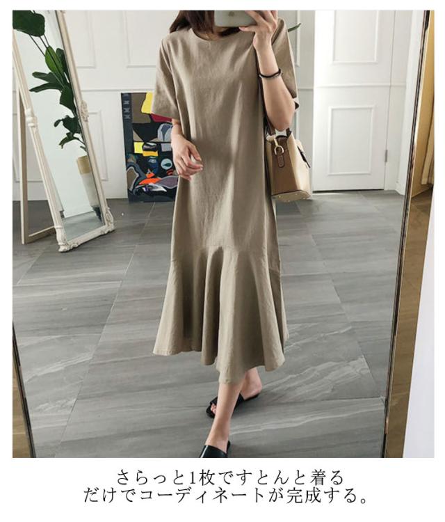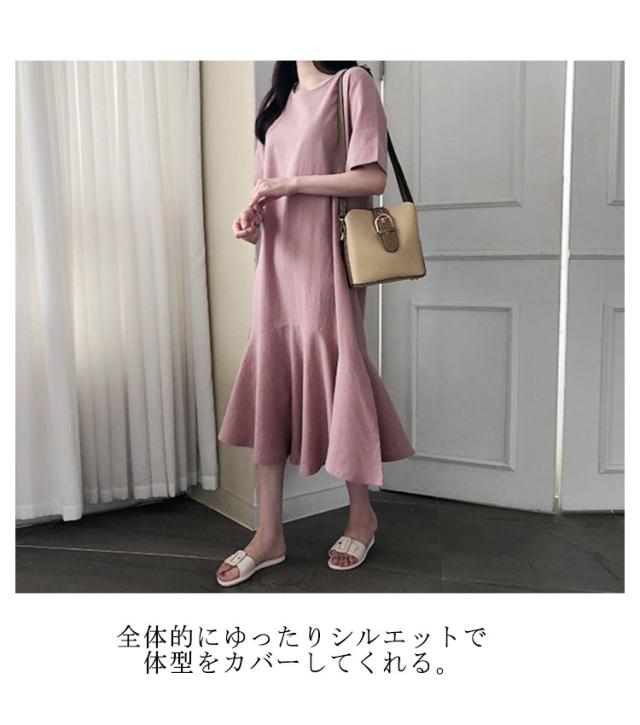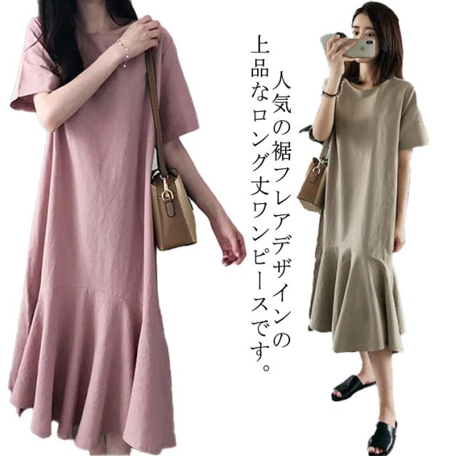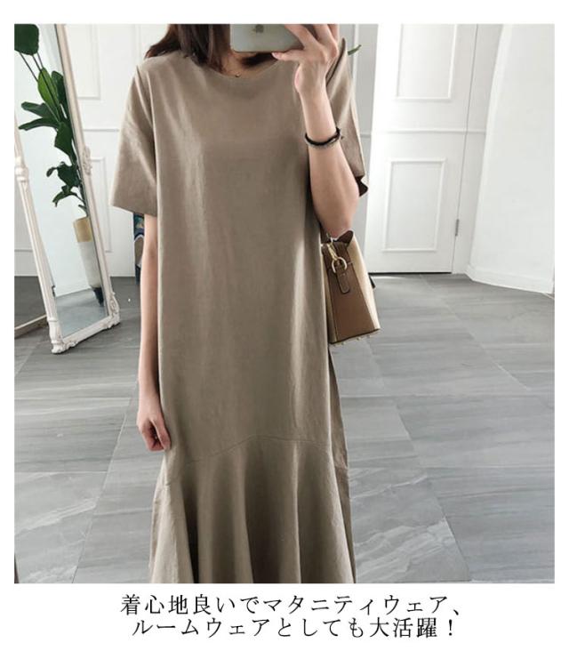 ワンピース レディース 半袖 裾フレア ミモレ ロング丈 綿 麻 マタニティ 体型カバー カジュアル 大きいサイズ ゆったり おしゃれ 大人可愛い 夏服 春 秋 シンプル 産前 産後 ワンピース