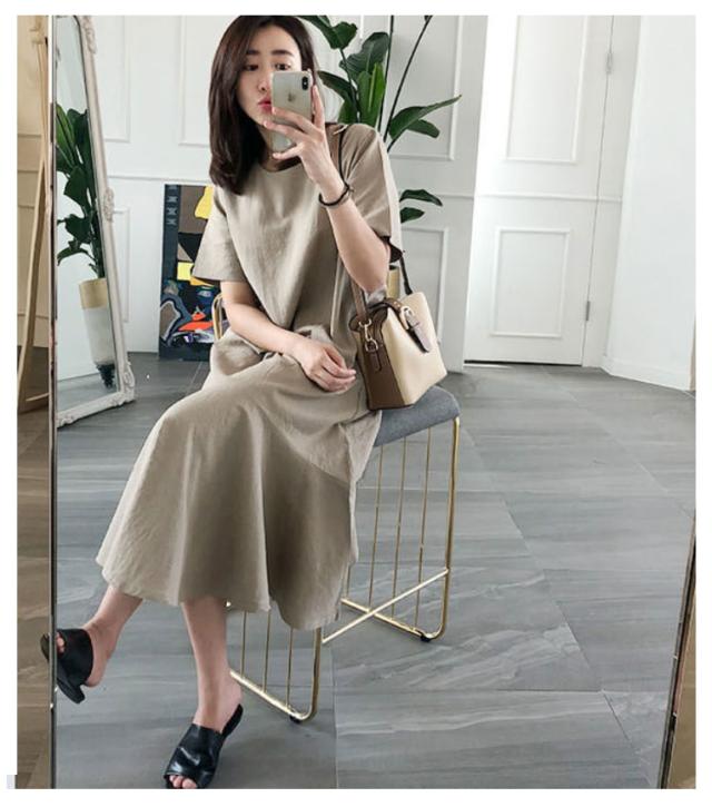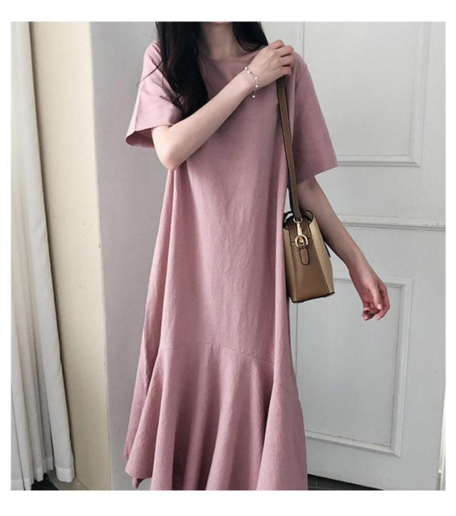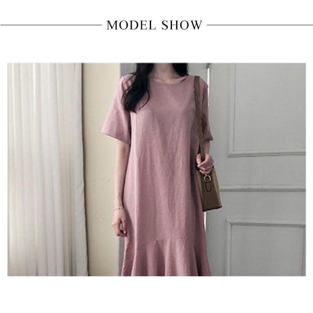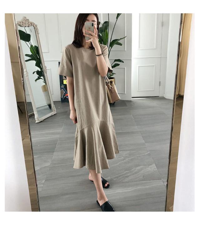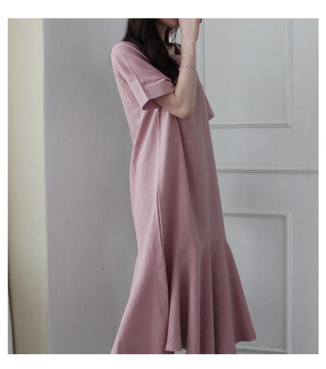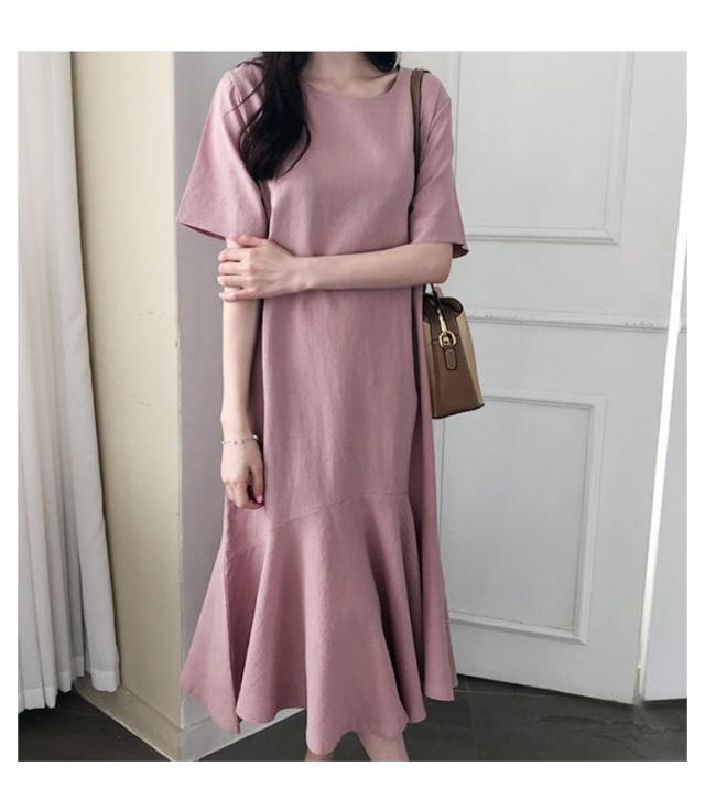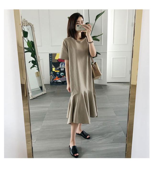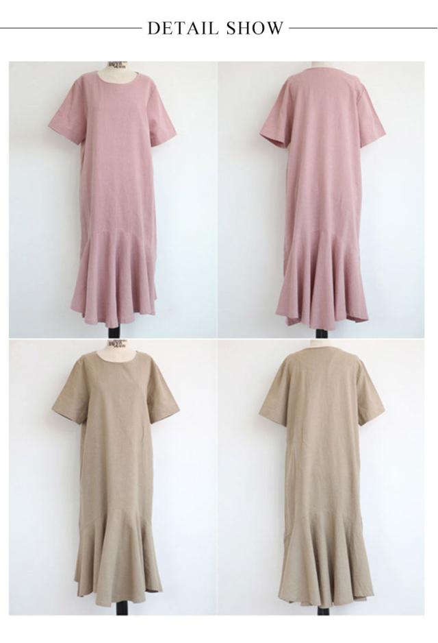 ワンピース レディース 半袖 裾フレア ミモレ ロング丈 綿 麻 マタニティ 体型カバー カジュアル 大きいサイズ ゆったり おしゃれ 大人可愛い 夏服 春 秋 シンプル 産前 産後 ワンピース