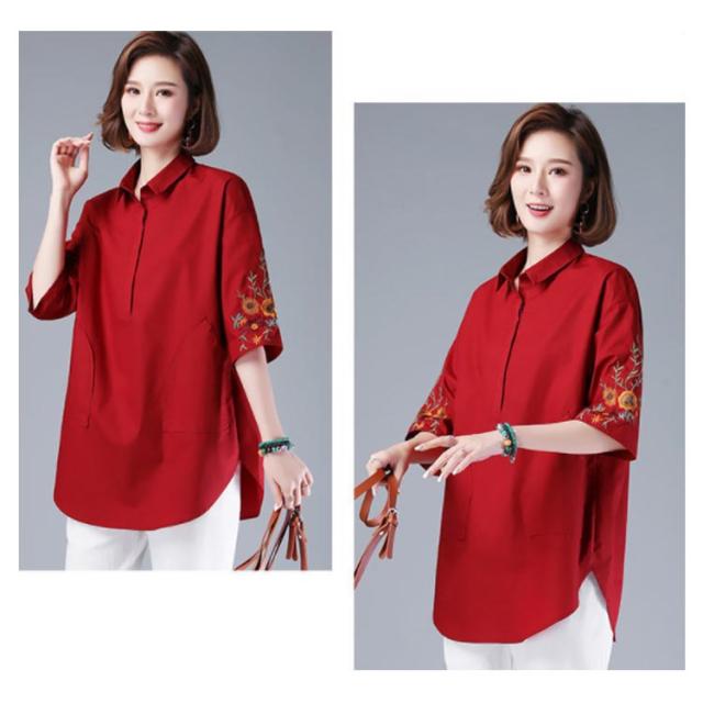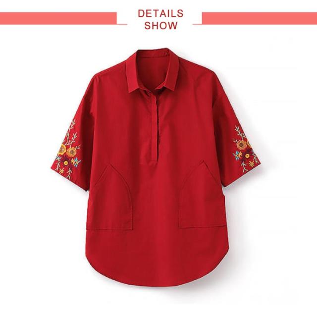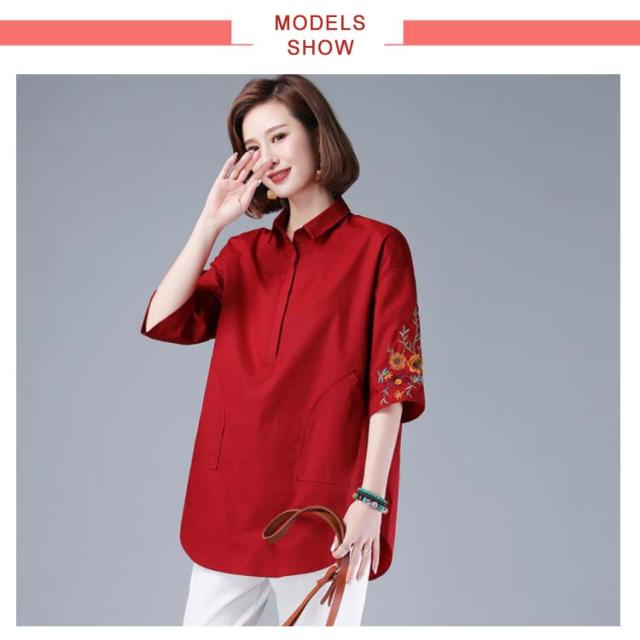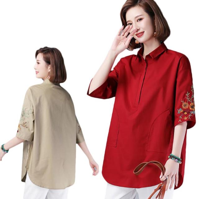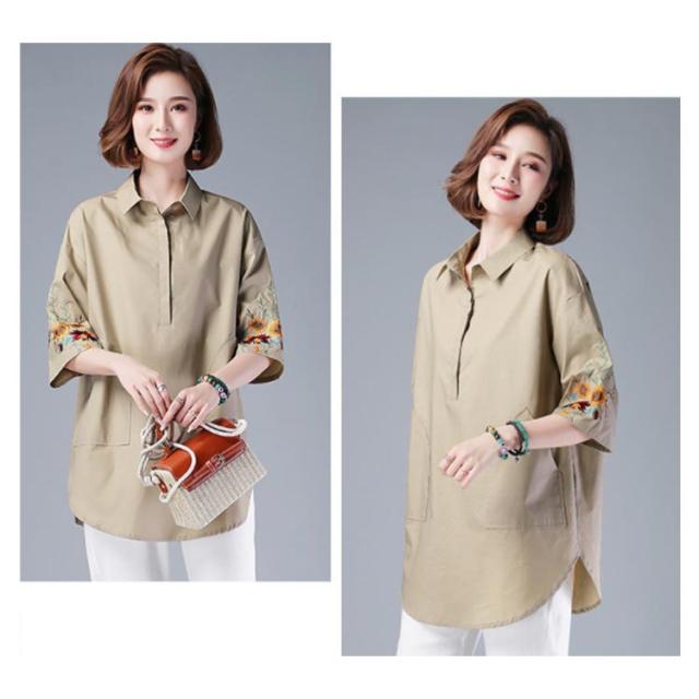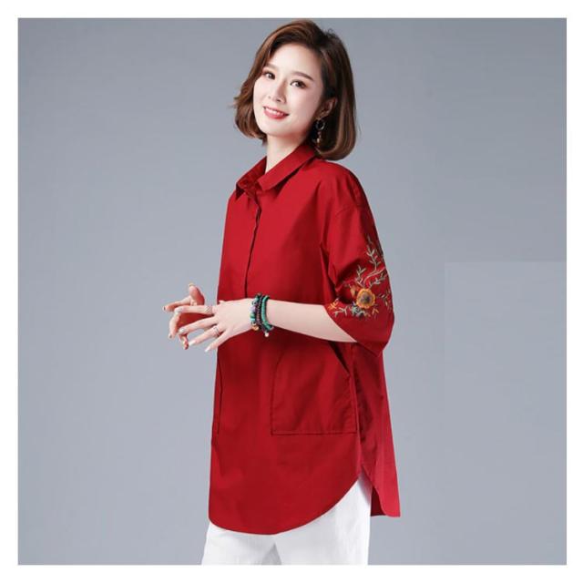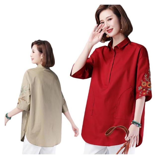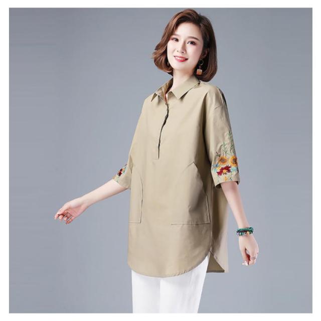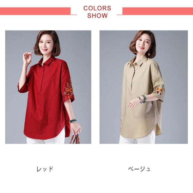 刺繍ブラウス ロングブラウス 夏 レディース オシャレブラウス シャツブラウス ゆったり 無地 ポケット付き 半袖 コットン 刺繍 シンプル カジュアル 送料無料 おしゃれ おでかけ ナチュラル