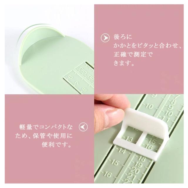 | お子様の足のサイズを測るフットスケールメジャーです。 健康的で環境に優しいABS素材を採用し、安全、安心に使用できます。 かかとを合わせてつま先部分のパーツを移動させるだけでなので測定も簡単! 6cm〜20cmまで計測可能、お子様と一緒に楽しく計測できます! 後ろにかかとをピタッと合わせ、正確で測定できます。 軽量でコンパクトなため、保管や使用に便利です。 | |