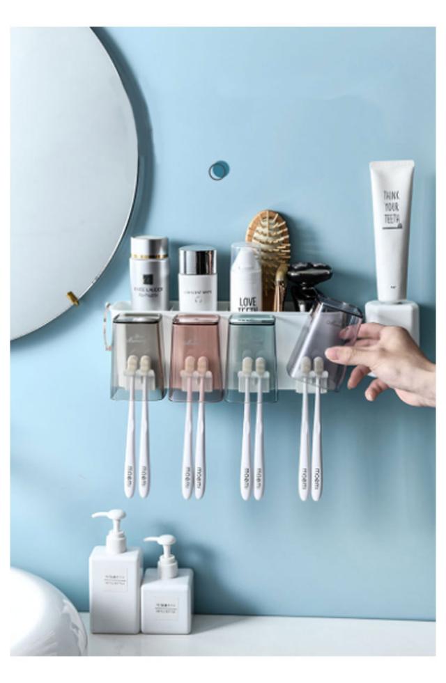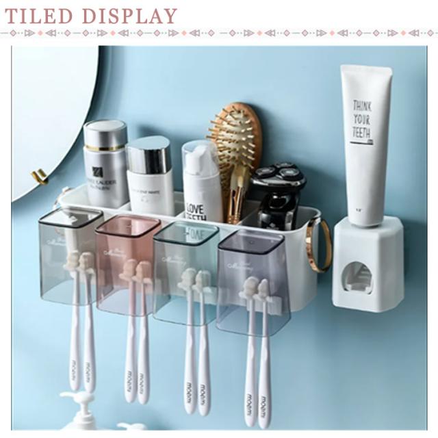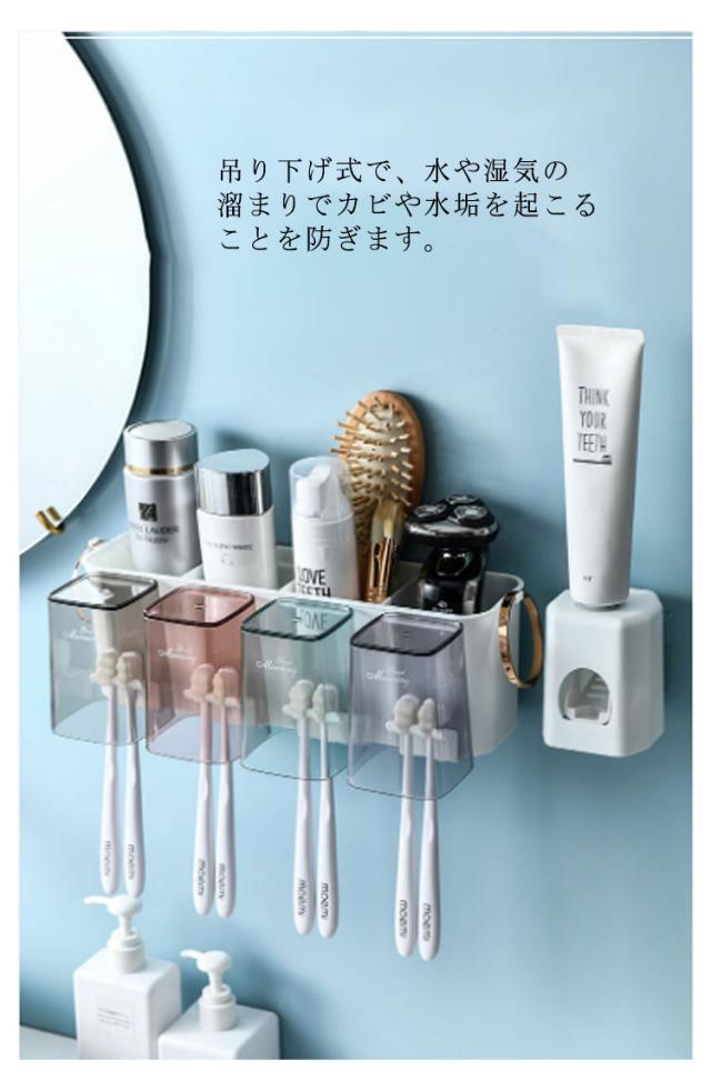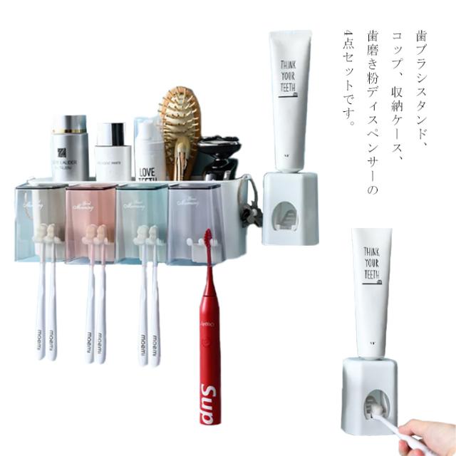 歯ブラシスタンド 4連 歯磨き粉ディスペンサー コップホルダー 壁掛け 歯ブラシホルダー 粘着式 穴あけ不要 洗面所 おしゃれ 歯ブラシ立て カビ防止 取り付け簡単 子供用 大人用 浴室 雑貨 防塵 衛生