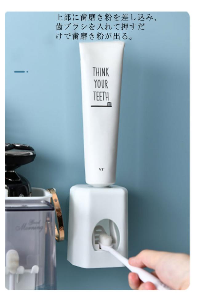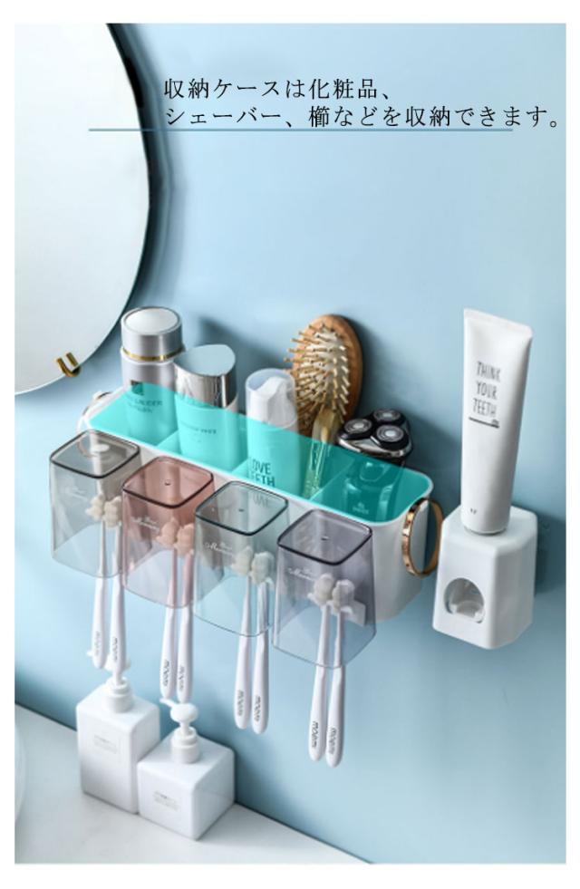 | 歯ブラシスタンド、コップ、収納ケース、歯磨き粉ディスペンサーの4点セットです。 歯ブラシ8本まで同時対応でき、家族全員で使用可能です。 吊り下げ式で、水や湿気の溜まりでカビや水垢を起こることを防ぎます。 収納ケースは化粧品、シェーバー、櫛などを収納できます。 収納ケースの底に排水・通気用の穴もあり、乾燥や清潔感を保てます。 上部に歯磨き粉を差し込み、歯ブラシを入れて押すだけで歯磨き粉が出る。 散乱しがちの洗面台の整理に役に立って、スッキリになります。 | |
