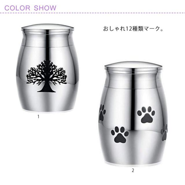 | 天国に旅立ってしまったけどこれからもずっと一緒。生きた証「遺骨」をそばに置いておきませんか? こんな可愛い分骨骨壷があったんだ!と亡くなったペットちゃんも大喜びの分骨用骨壷です。 オールステンレスの重厚感。 おしゃれ12種類マーク。 今までに無かったとっても素敵なお骨入れです。 ペットのお骨 爪 遺毛 歯 ヒゲ等をお納め頂き、供養なさって下さい。 | |