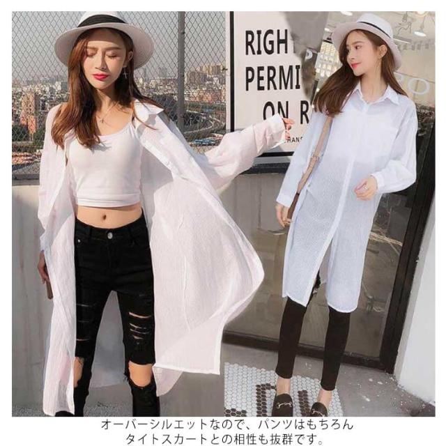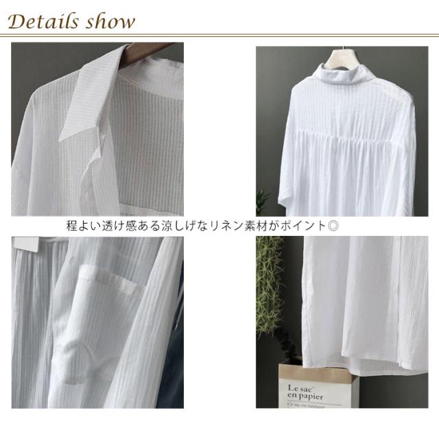 | トレンドのシアー素材のロングシャツ。 長いゆるッとしたシルエットで体型カバーにも効果的です。 程よい透け感ある涼しげなリネン素材がポイント◎ 肌寒い季節の防寒や夏の冷房対策と紫外線対策にも役立ちます。 オーバーシルエットなので、パンツはもちろんタイトスカートとの相性も抜群です。 | |
