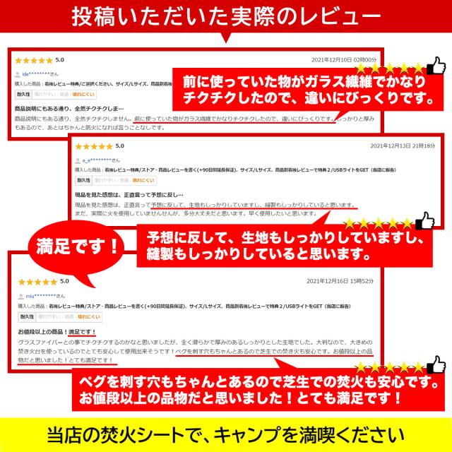 - 2022年8月11日の夕方に注文して8月13日の朝着きました。 焚火台シートも、思った通りの物で使うのが楽しみです。 グラスファイバーの繊維でしっかり縫製もされていて良いものです。