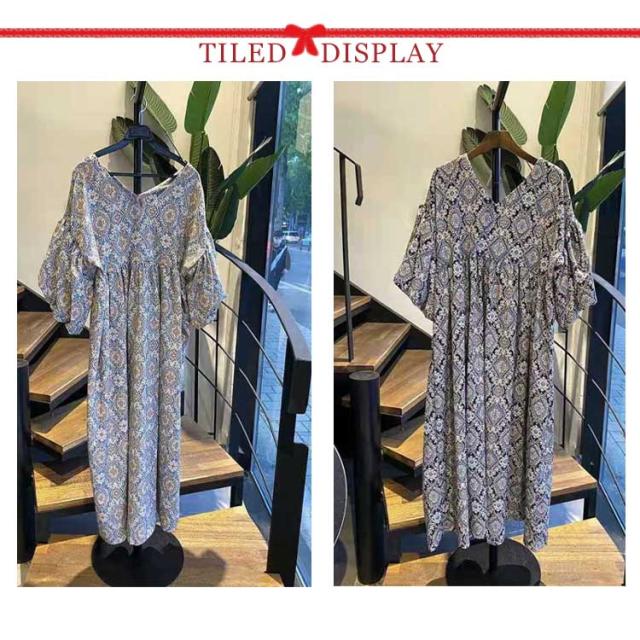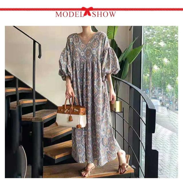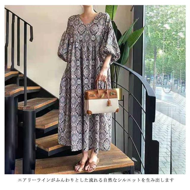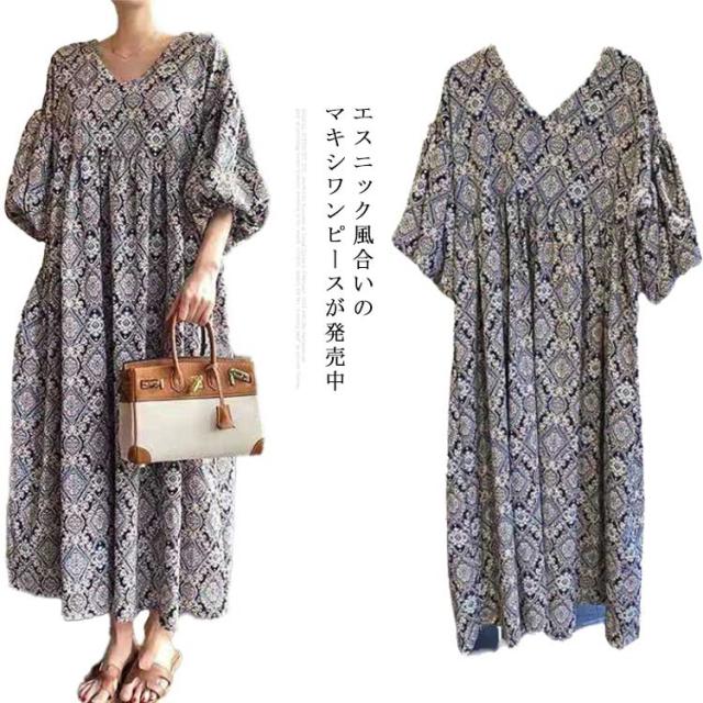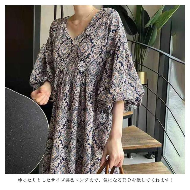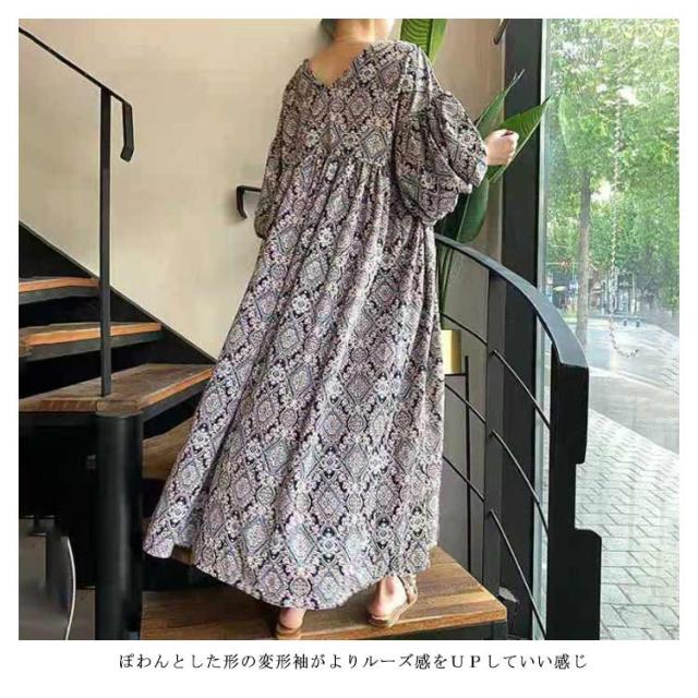 【送料無料】ワンピース レディース マキシ丈ワンピース 七分袖 ロング丈 Aライン Vネック エスニック ゆったり 花柄 エスニック風 ボヘミアン リゾートワンピース 上品 春秋 キレイめ オシャレ