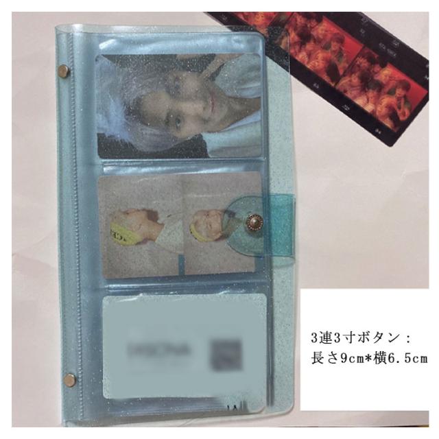 | サイズについての説明 | 2連3寸:長さ9cm*横6.5cm 3連3寸:長さ9cm*横6.5cm カードアルバム:長さ8.5cm*横5.5cm(普通の3寸よりちさいです。カード、銀行カード、名刺、チケットなどに適用!) 3連3寸ボタン:長さ9cm*横6.5cm 2連4寸:長さ10.5cm*横7.8cm 6寸:長さ15.9cm*横10.5cm |