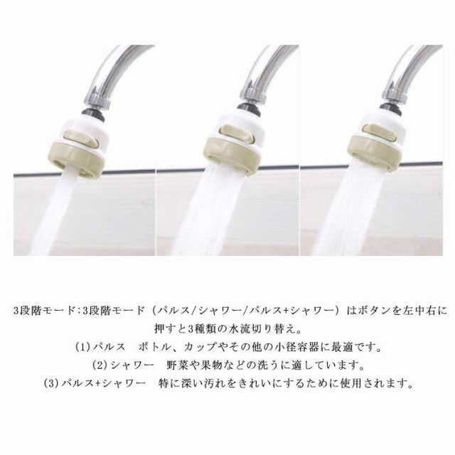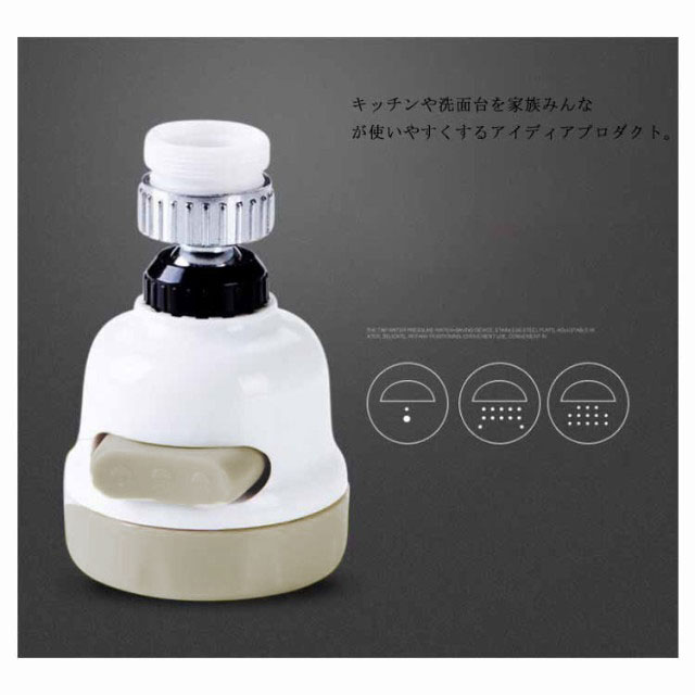 | 3段階モード節水シャワーヘッド♪ キッチンや洗面台を家族みんなが使いやすくするアイディアプロダクト。 3段階モード:3段階モード(パルス/シャワー/パルス+シャワー)はボタンを左中右に押すと3種類の水流切り替え。(1)パルス ボトル、カップやその他の小径容器に最適です。(2)シャワー 野菜や果物などの洗うに適しています。(3)パルス+シャワー 特に深い汚れをきれいにするために使用されます。 360度回転:ヘッドの向き方向が変えられるため、水流の方向が自由に変換できます。気泡仕様で四方八方へ飛び散る事はなく、水はねしにくいです。角度はあなたの選択に任せます、使いやすいです。 水はねを防ぐ&節水:吐水は泡沫状で水ハネを抑え。空気注入設計、節水構造により、水がより豊富になります、高い節水率を発揮、40%〜70%まで水を節約します(通常のバブラーと比較して)。節水率と水の勢いの間でコントロールが良い。 | |