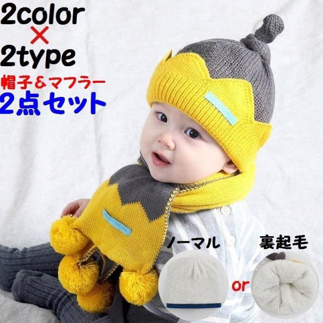 ベビー帽子 マフラー 2点セット 裏起毛 ボア ニット帽 ワッチキャップ ビーニー とんがりぼうし ベビー 防寒 頭部保護 寒さ対策 タグ ポンポン付