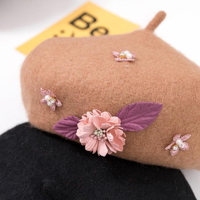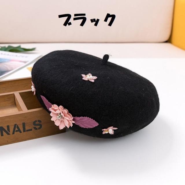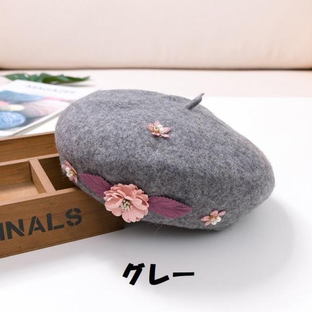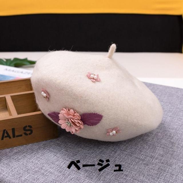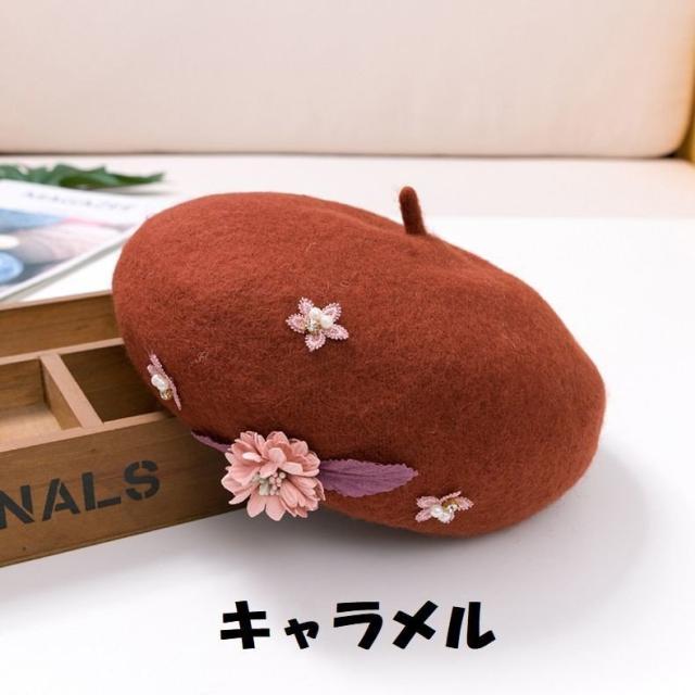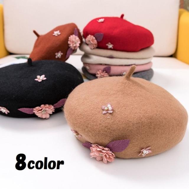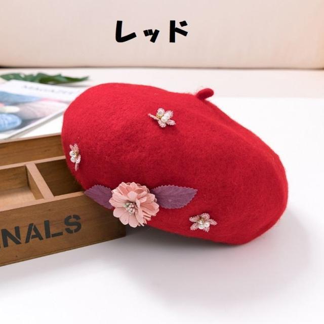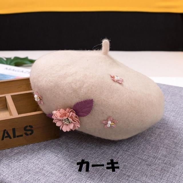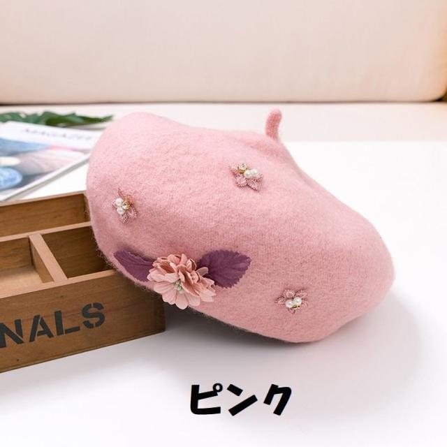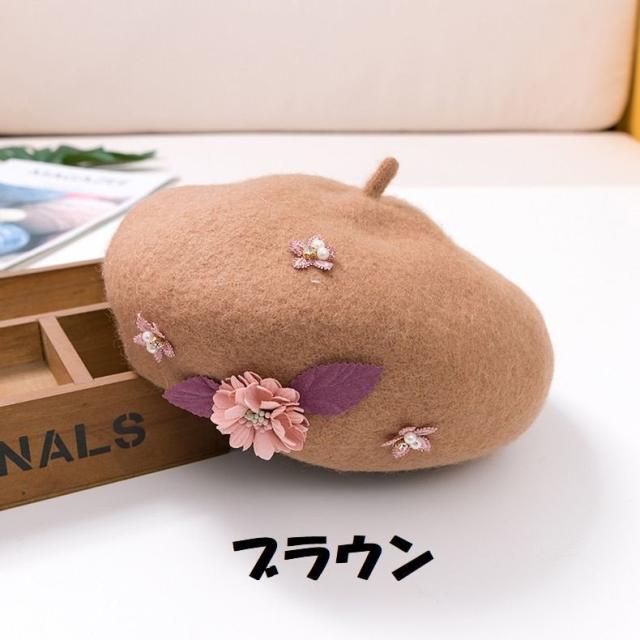 帽子 ベレー帽 キッズ 子供用 お花 フラワー フェイクパール 立体的 飾り付き 画家風 防寒 おしゃれ かわいい 女の子 女児 ガールズ よそ行き