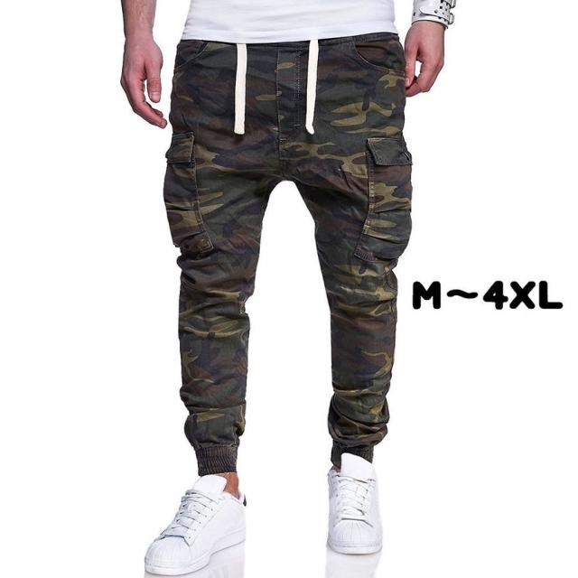 ロングパンツ カーゴパンツ メンズ ボトムス 長ズボン 迷彩柄 ミリタリー風 裾ゴム ウエスト紐 膝上ポケット バックポケット ポケット多数 カジュア