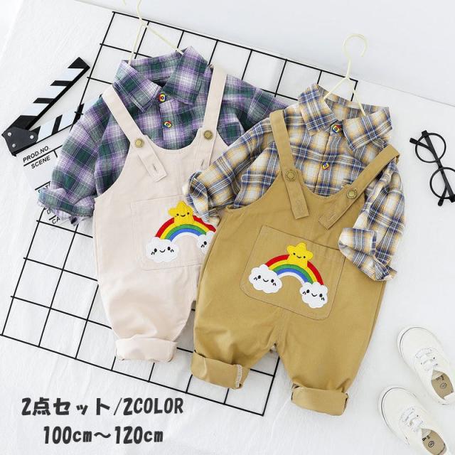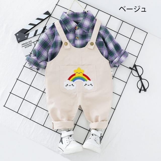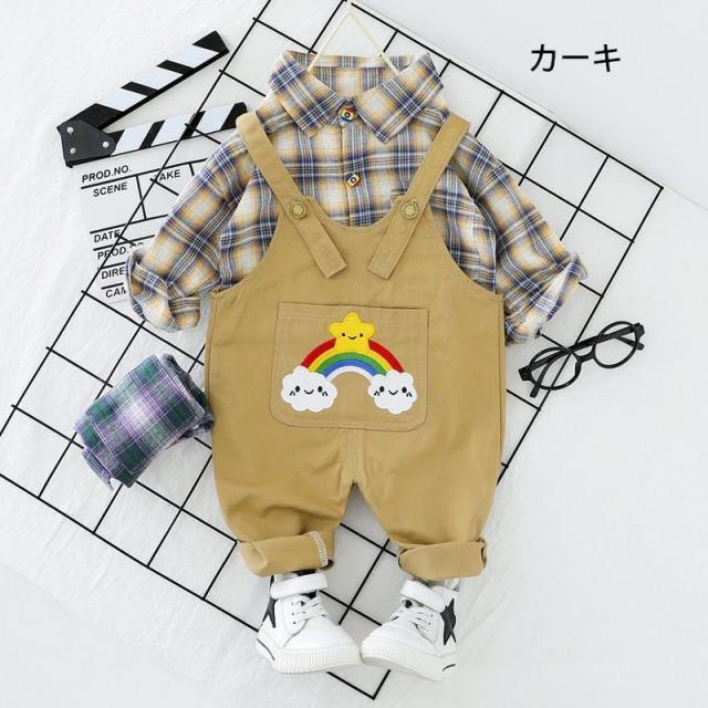 2点セット キッズ 男の子 オーバーオール 長ズボン 長袖シャツ ブラウス 襟 ポケット アップリケ 虹 シンプル カジュアル 可愛い おしゃれ 着ま