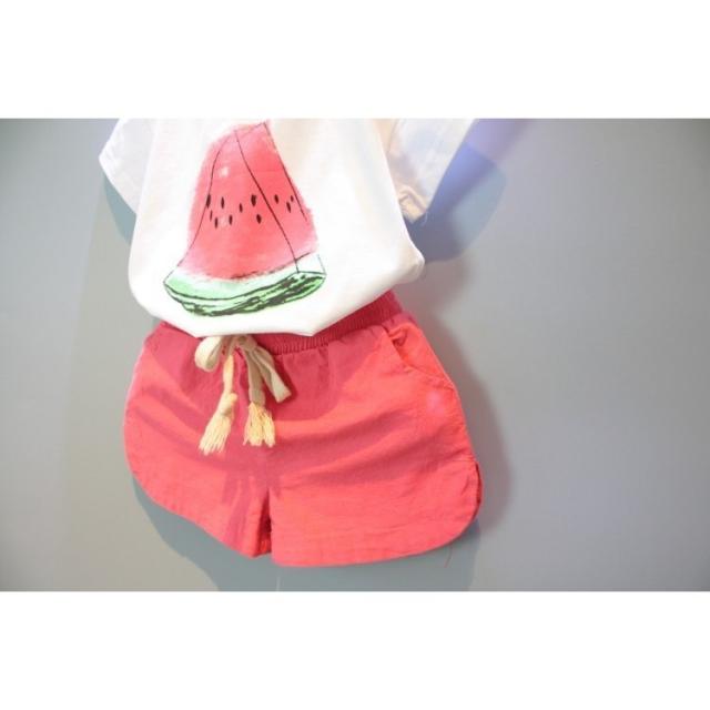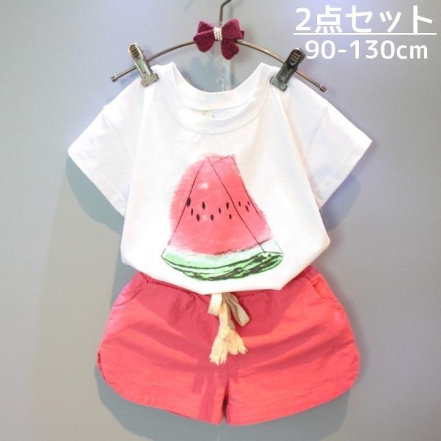 セットアップ 上下2点セット 子供用 キッズ Tシャツ 半袖 ショートパンツ 短パン カットソー 丸襟 スイカ柄 ウエストゴム 女の子 男の子 トップ