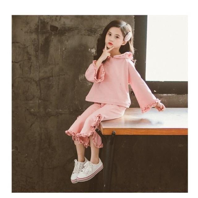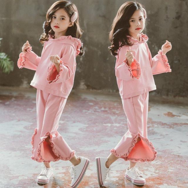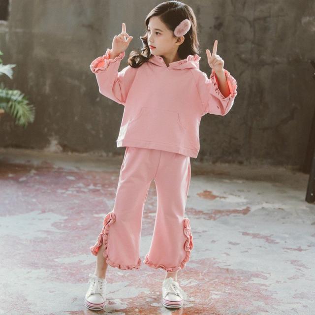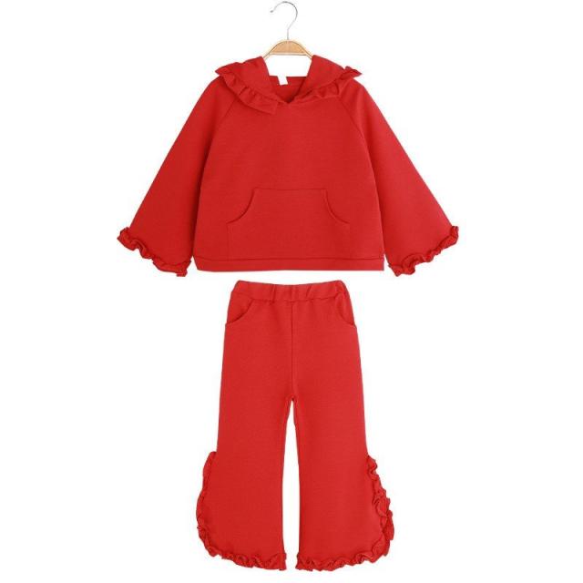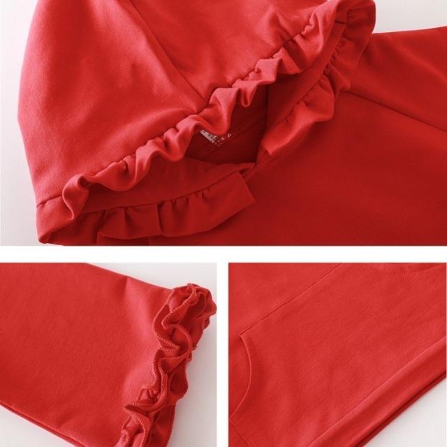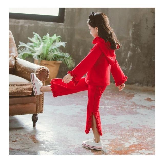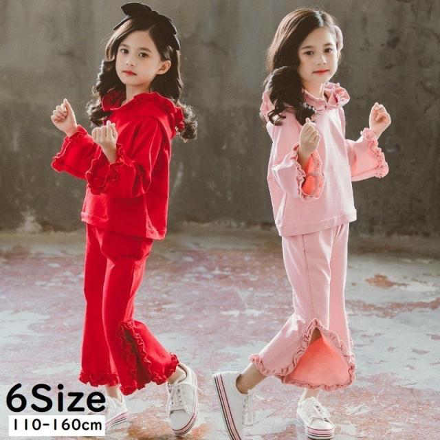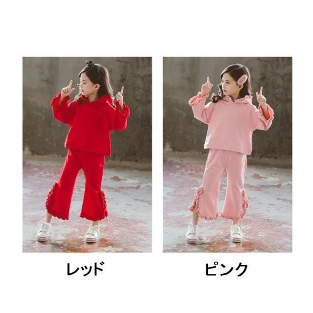 セットアップ キッズ 女の子 子供用 長袖 長ズボン パンツ 2点セット 上下セット フード付き 無地 フリル かわいい レッド