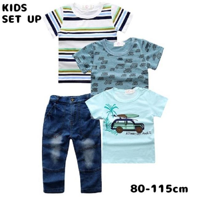 セットアップ 上下セット 子供服 キッズ ベビー Tシャツ 3枚セット デニムパンツ 半袖 長ズボン ロングパンツ 男の子 女の子 クルーネック トッ