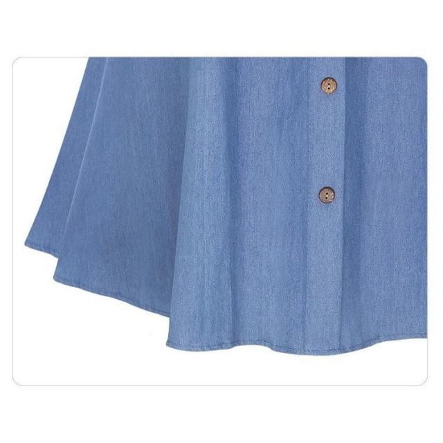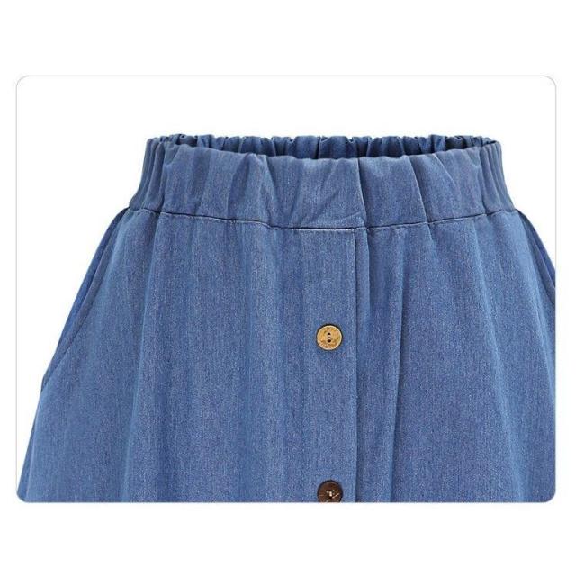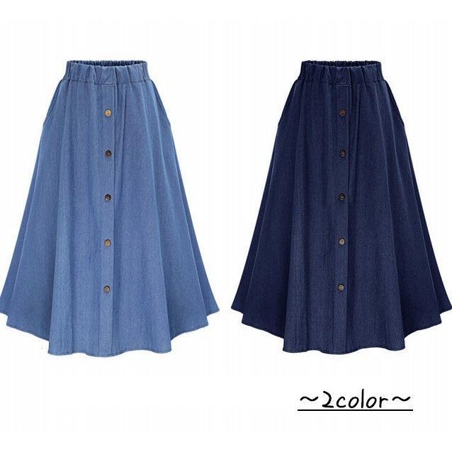 スカート レディース 膝丈 ボタンつき ウエストゴム ロングスカート デニム風 女性 婦人 ポケットつき カジュアルデザイン おしゃれ