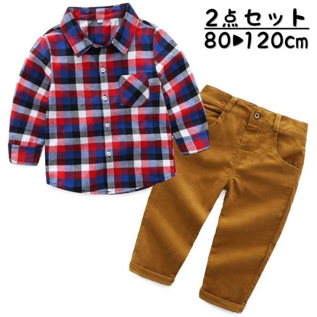 セットアップ 上下セット 2点セット 長袖シャツ 前ボタン ロングパンツ 長ズボン コーデュロイ 子供服 キッズ カジュアル チェック柄 無地 トップ