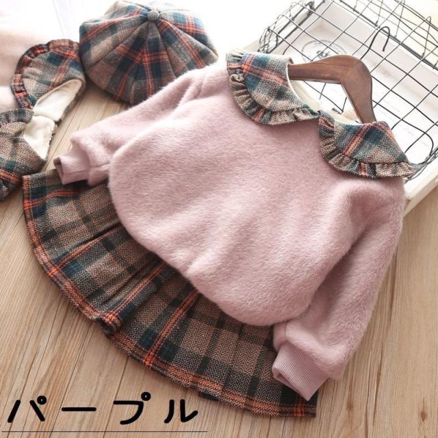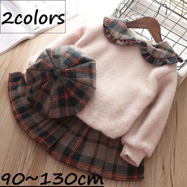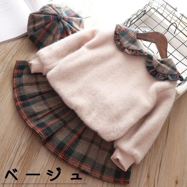 セットアップ スカート キッズ チェック 女の子 3点セット 上下セット ベレー帽 帽子 かわいい おしゃれ 裏起毛 あったか