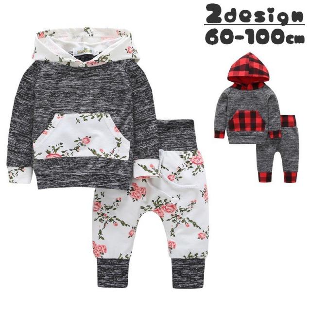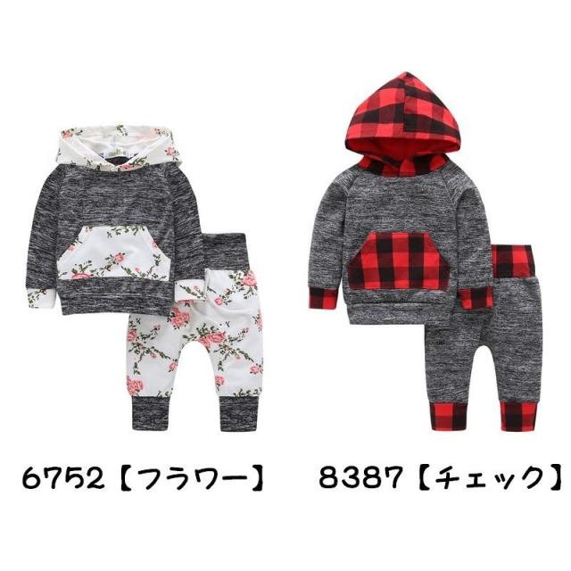セットアップ パーカー 長袖 ロングパンツ 長ズボン ベビー服 赤ちゃん 子供服 キッズ スウェット プルオーバー フーディー 花柄 チェック 女の子
