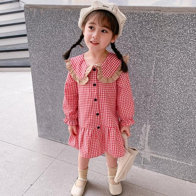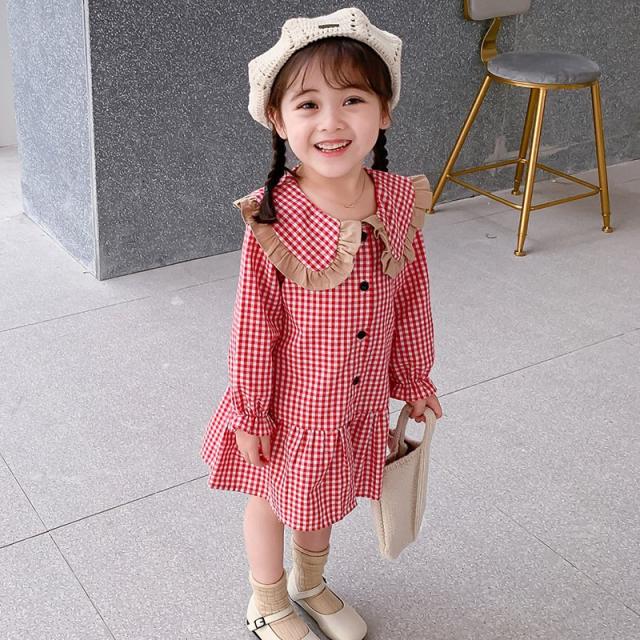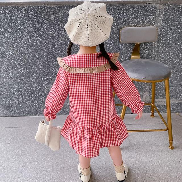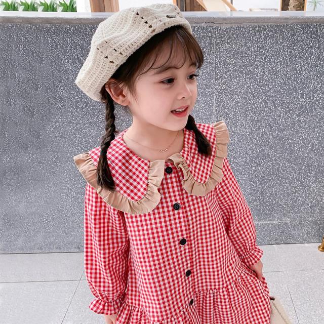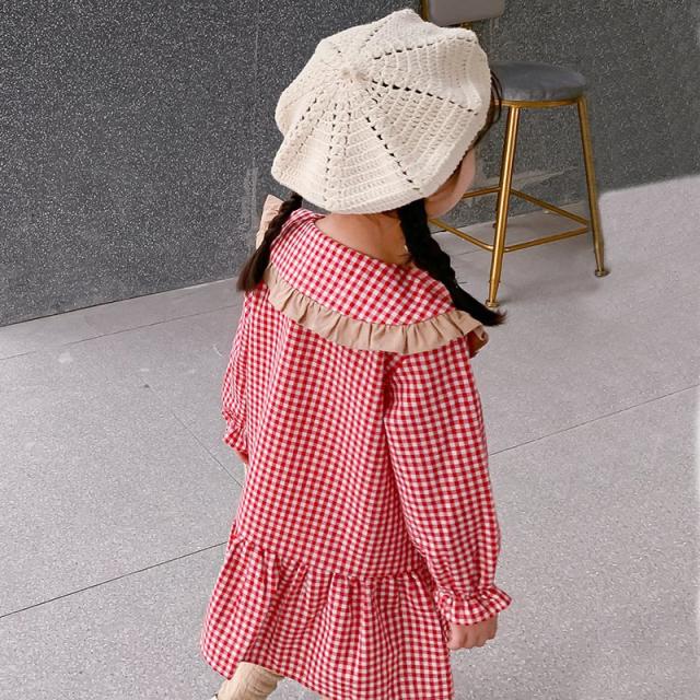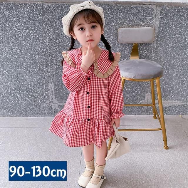 ワンピース キッズ 子供服 ベビー 長袖 ラウンドカラー フリル バルーンスリーブ ギャザー ボタン ギンガムチェック かわいい